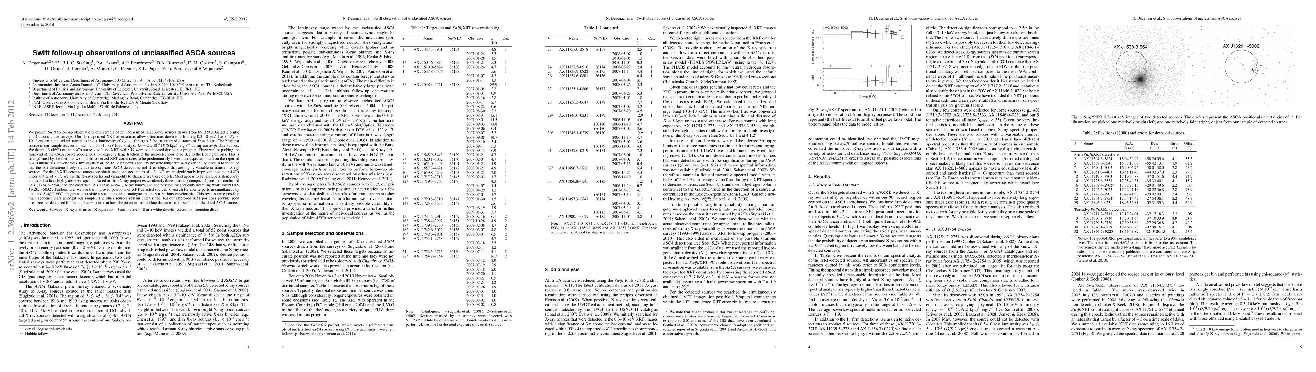 We present Swift follow-up observations of a sample of 35 unclassified faint X-ray sources drawn from the ASCA Galactic centre and plane surveys. Our short pointed XRT observations allow detections down to a limiting 0.3-10 keV flux of ~1E-13 erg cm-2 s-1, which translates into a luminosity of ~1E33 erg s-1 for an assumed distance of D=8 kpc. The brightest source in our sample reaches a maximum 0.3-10 keV luminosity of ~2E36 (D/8kpc)^2 erg s-1 during our observations. We detect 16 (46%) of the ASCA sources with the XRT, while 19 were not detected during our program. Since we are probing the faint end of the ASCA source populations, we expect a large fraction of the non-detections to be due to the Eddington bias. This is strengthened by the fact that we find the observed XRT count rates to be predominantly lower than expected based on the reported ASCA intensities. Investigation of the ASCA properties and long-term X-ray variability leads us to conclude that the non-detections likely include two spurious ASCA detections and three objects that are variable or transient X-ray sources. For the 16 XRT-detected sources we obtain positional accuracies of ~2-4", which significantly improves upon their ASCA uncertainties of ~1'. We use the X-ray spectra and variability to characterise these objects. Most appear to be faint, persistent X-ray emitters that have highly absorbed spectra. Based on their X-ray properties we identify three accreting compact objects: one confirmed (AX J1754.2-2754) and one candidate (AX J1538.3-5541) X-ray binary, and one possible magnetically accreting white dwarf (AX J1620.1-5002). Furthermore, we use the improved positions of XRT-detected sources to search for counterparts in simultaneously obtained Swift/UVOT images and possible associations with cataloged sources at various wavelengths. This reveals three possible main sequence stars amongst our sample.