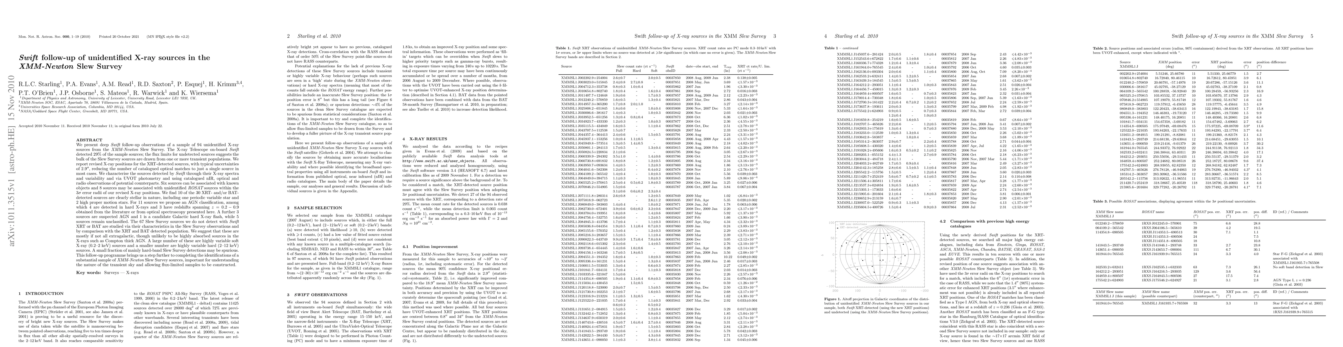 This study reports deep Swift follow-up observations of 94 unidentified X-ray sources from the XMM-Newton Slew Survey, identifying 29% of them and suggesting most are transient populations. The study revises X-ray positions and characterizes detected sources, finding 10 stellar, 11 AGN, and 67 likely extragalactic sources, contributing to the identification of Slew Survey sources.
