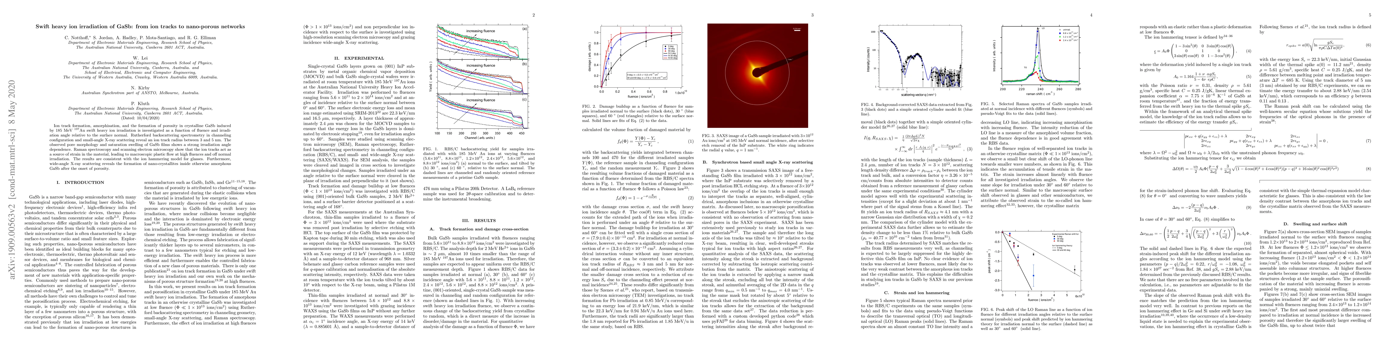 This study investigates the effects of 185 MeV $^{197}$Au swift heavy ion irradiation on GaSb, revealing ion track formation and the development of nano-porous networks. The irradiation angle significantly influences the pore morphology and swelling, with plastic flow observed at high fluences, consistent with the ion hammering model.