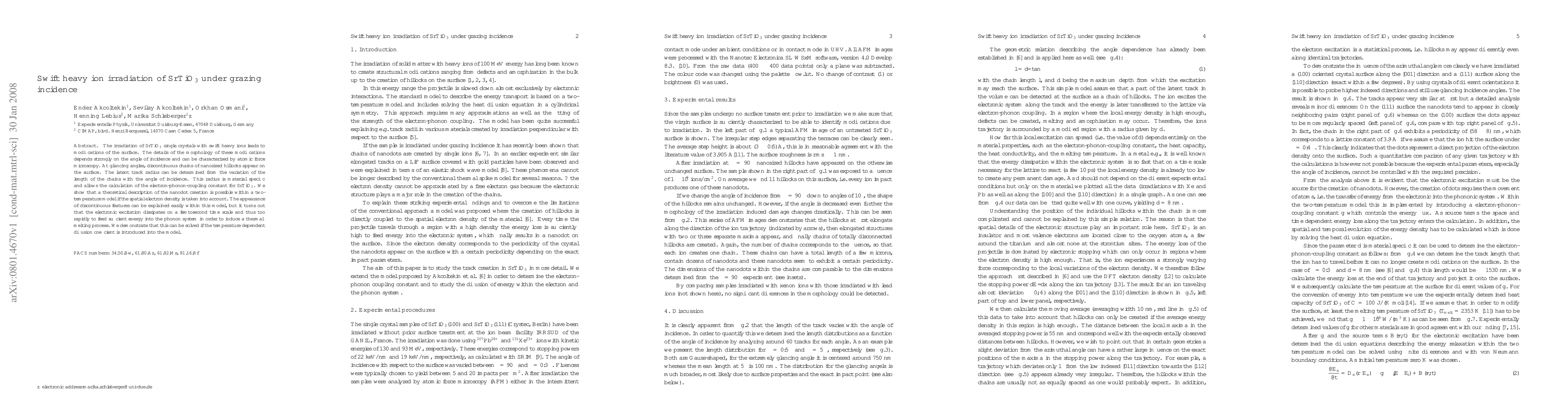 The irradiation of SrTiO$_3$ single crystals with swift heavy ions leads to modifications of the surface. The details of the morphology of these modifications depends strongly on the angle of incidence and can be characterized by atomic force microscopy. At glancing angles, discontinuous chains of nanosized hillocks appear on the surface. The latent track radius can be determined from the variation of the length of the chains with the angle of incidence. This radius is material specific and allows the calculation of the electron-phonon-coupling constant for SrTiO$_3$. We show that a theoretical description of the nanodot creation is possible within a two-temperature model if the spatial electron density is taken into account. The appearance of discontinuous features can be explained easily within this model, but it turns out that the electronic excitation dissipates on a femtosecond time scale and thus too rapidly to feed sufficient energy into the phonon system in order to induce a thermal melting process. We demonstrate that this can be solved if the temperature dependent diffusion coefficient is introduced into the model.