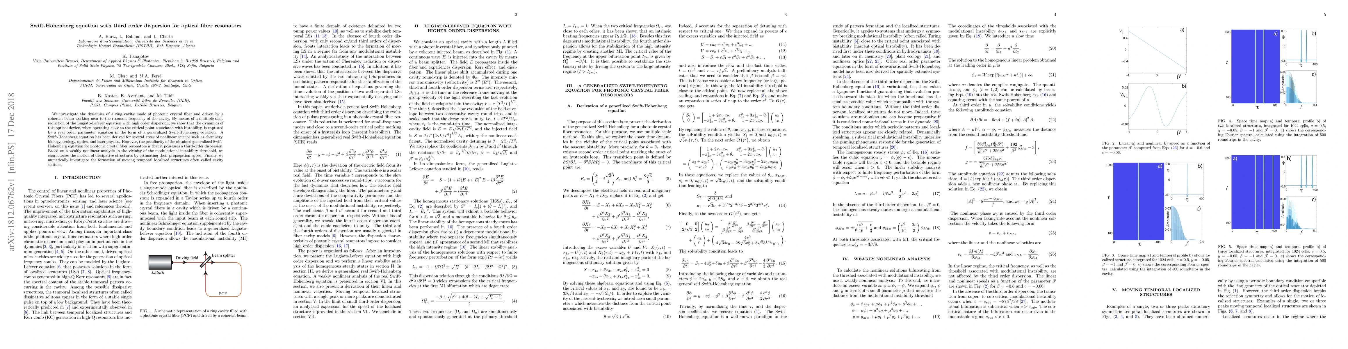 This paper investigates the dynamics of a photonic crystal fiber ring cavity driven by a coherent beam, revealing that its behavior near the critical bistability point is described by a generalized Swift-Hohenberg equation with third-order dispersion. The study characterizes the propagation speed of dissipative structures and numerically explores the formation of cavity solitons.