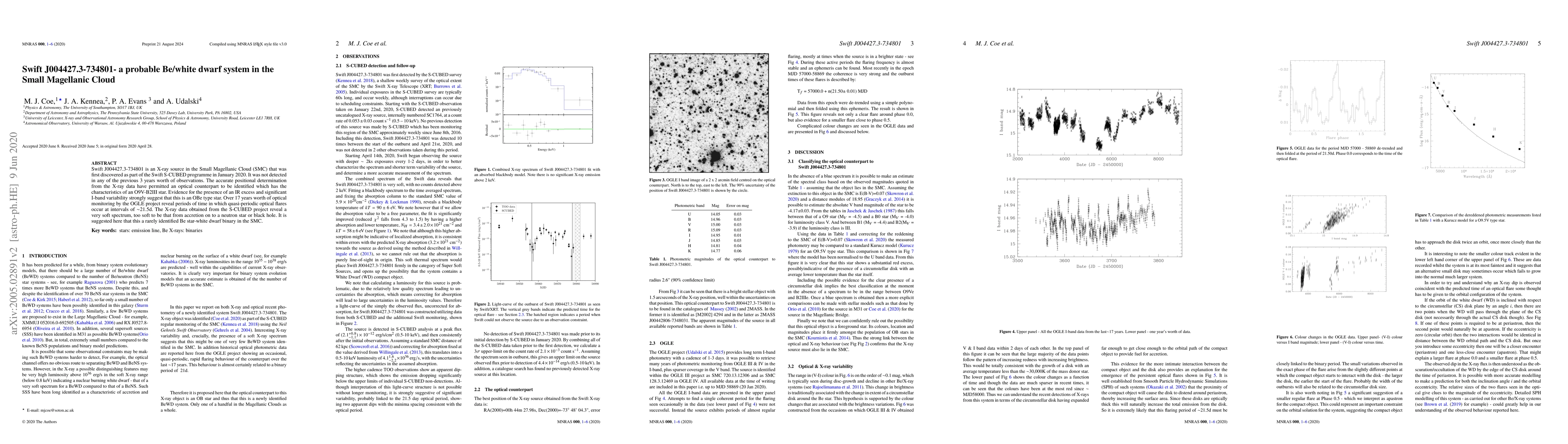 Swift J004427.3-734801 is an X-ray source in the Small Magellanic Cloud identified as an O9V-B2III star with IR excess and I-band variability, suggesting it is an OBe type star. The X-ray source is likely a Be star-white dwarf binary system, evidenced by quasi-periodic optical flares and a soft X-ray spectrum.