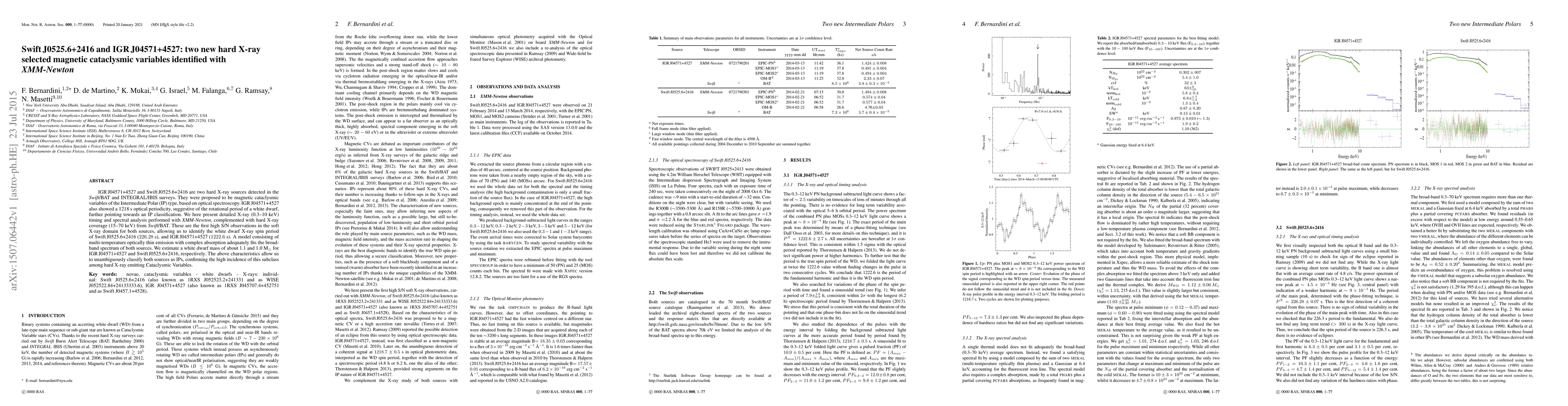 This paper identifies two new magnetic cataclysmic variables, Swift J0525.6+2416 and IGR J04571+4527, using XMM-Newton and Swift/BAT data, confirming their classification as Intermediate Polars (IPs) based on X-ray spin periods and white dwarf mass estimates.