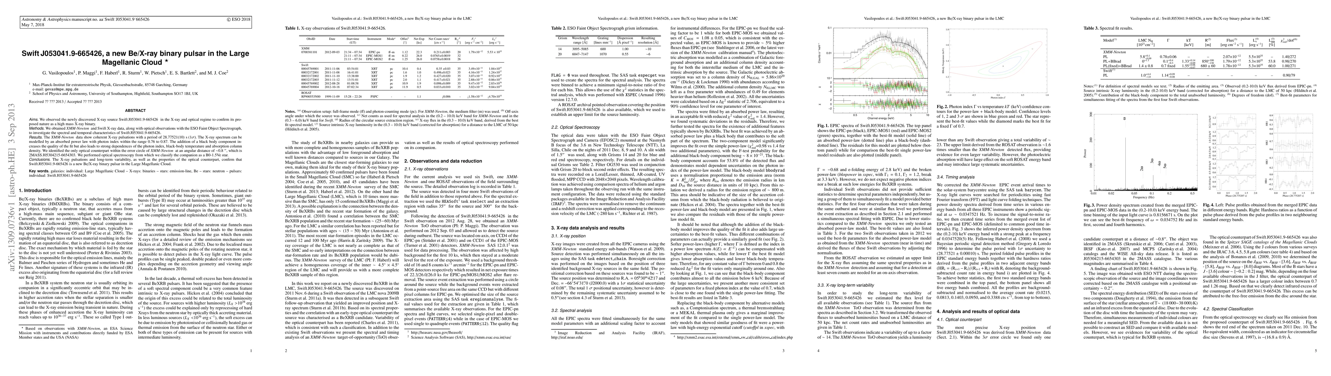 Researchers discovered a new Be/X-ray binary pulsar in the Large Magellanic Cloud, Swift J053041.9-665426, confirming its high mass X-ray binary nature through X-ray and optical observations.
