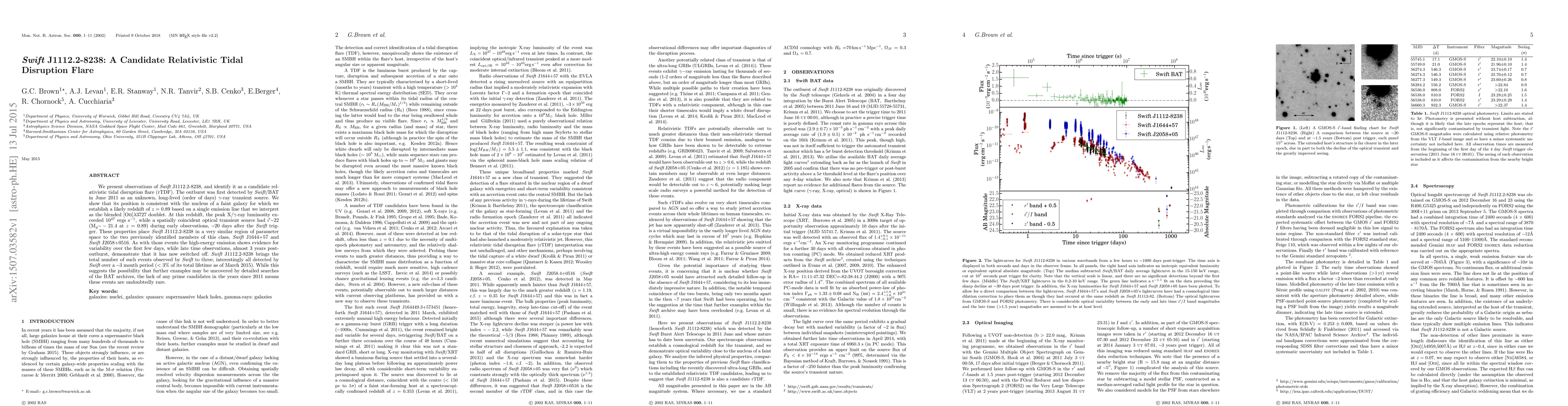 Swift J1112.2-8238 is identified as a candidate relativistic tidal disruption flare (rTDF), detected as a long-lived gamma-ray transient in 2011, with a redshift of $z=0.89$. Its high-energy luminosity and variability suggest it belongs to a rare class of events similar to Swift J1644+57 and Swift J2058+0516.