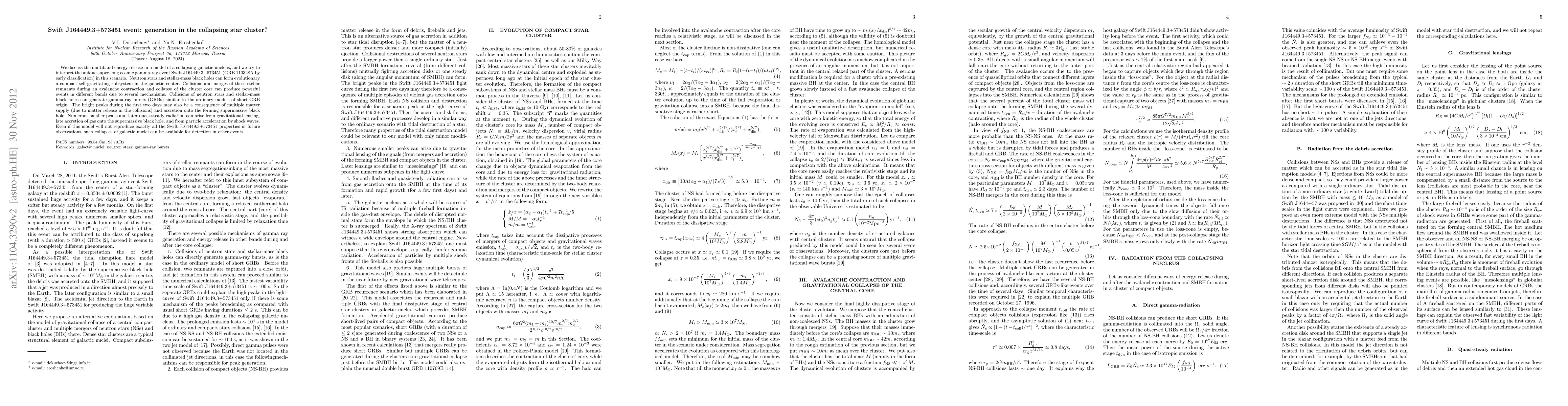We discuss the multiband energy release in a model of a collapsing galactic nucleus, and we try to interpret the unique super-long cosmic gamma-ray event Swift J164449.3+573451 (GRB 110328A by early classification) in this scenario. Neutron stars and stellar-mass black holes can form evolutionary a compact self-gravitating subsystem in the galactic center. Collisions and merges of these stellar remnants during an avalanche contraction and collapse of the cluster core can produce powerful events in different bands due to several mechanisms. Collisions of neutron stars and stellar-mass black holes can generate gamma-ray bursts (GRBs) similar to the ordinary models of short GRB origin. The bright peaks during the first two days may also be a consequence of multiple matter supply (due to matter release in the collisions) and accretion onto the forming supermassive black hole. Numerous smaller peaks and later quasi-steady radiation can arise from gravitational lensing, late accretion of gas onto the supermassive black hole, and from particle acceleration by shock waves. Even if this model will not reproduce exactly all the Swift J164449.3+573451 properties in future observations, such collapses of galactic nuclei can be available for detection in other events.