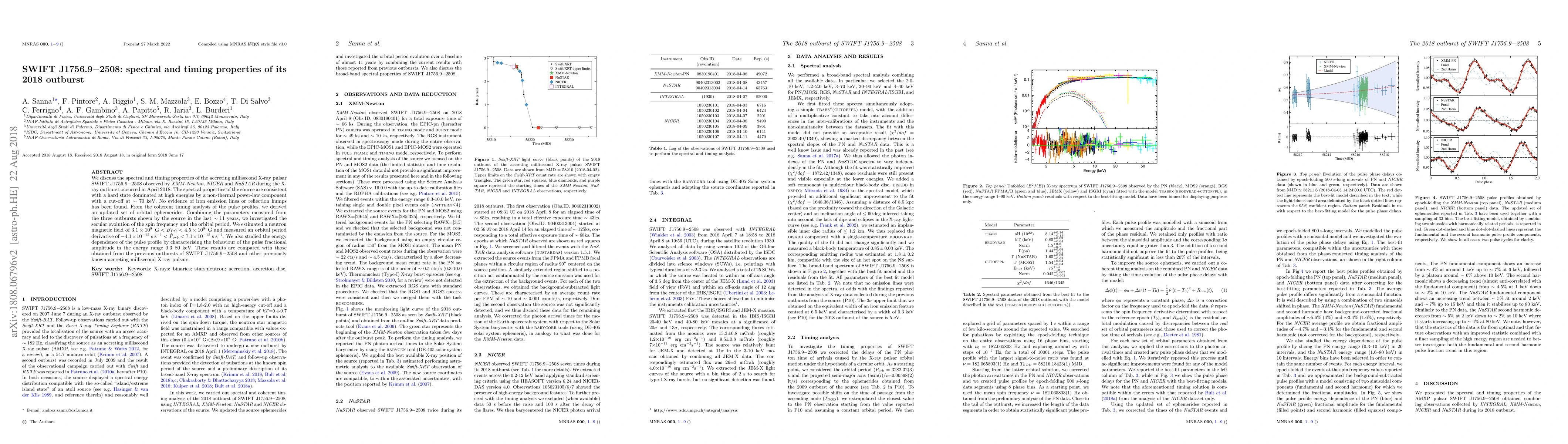 This paper analyzes the spectral and timing characteristics of the 2018 X-ray outburst from SWIFT J1756.9-2508 using data from XMM-Newton, NICER, and NuSTAR. The source exhibits a hard state dominated by a high-energy non-thermal power-law component, with no evidence of iron lines or reflection features. The study updates orbital ephemerides and investigates the long-term evolution of spin frequency and orbital period, estimating a neutron magnetic field and orbital period derivative.