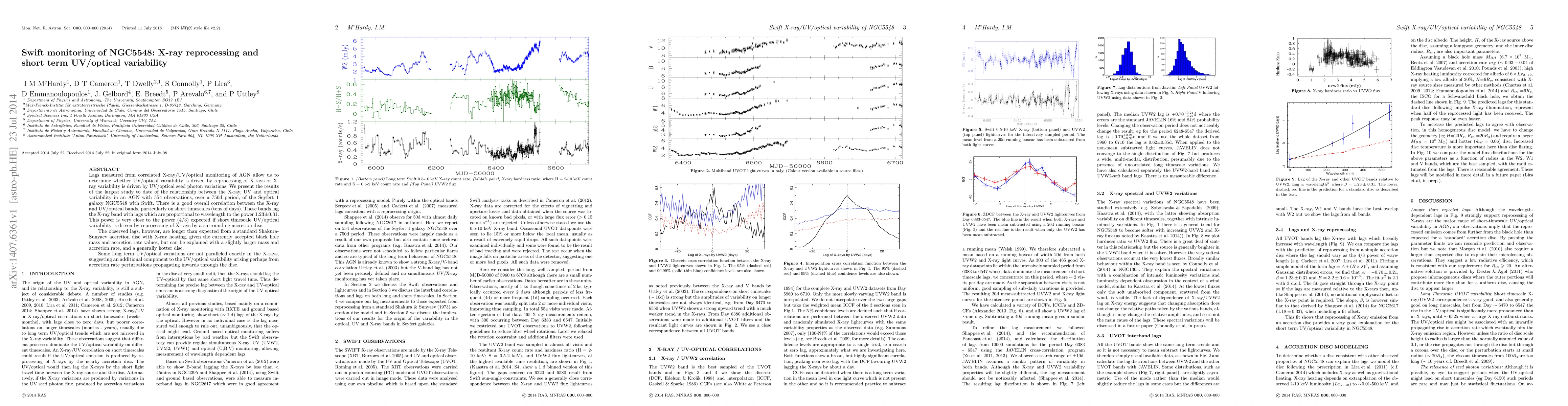 This study uses Swift observations to monitor the AGN NGC 5548, finding strong short-term correlations between X-ray and UV/optical variability, suggesting reprocessing of X-rays by the accretion disc. The observed lags indicate a hotter disc than expected, with some long-term UV/optical variations hinting at additional variability sources.