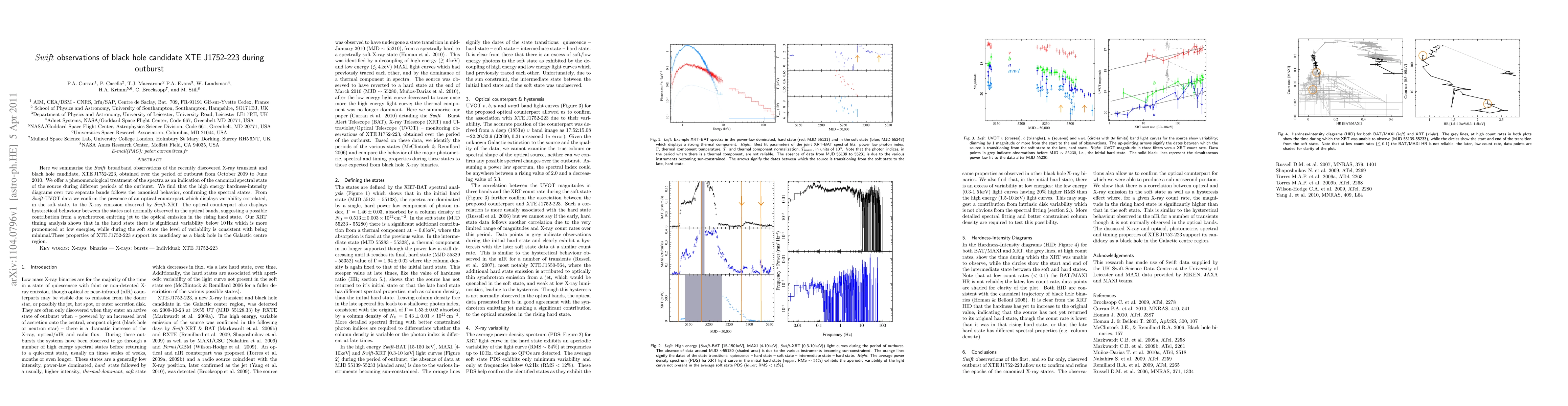 This paper summarizes Swift observations of the black hole candidate XTE J1752-223 during its outburst from October 2009 to June 2010, confirming its spectral states and identifying an optical counterpart with variability correlated to X-ray emissions. The study also suggests a synchrotron jet contribution in the optical emission during the rising hard state.