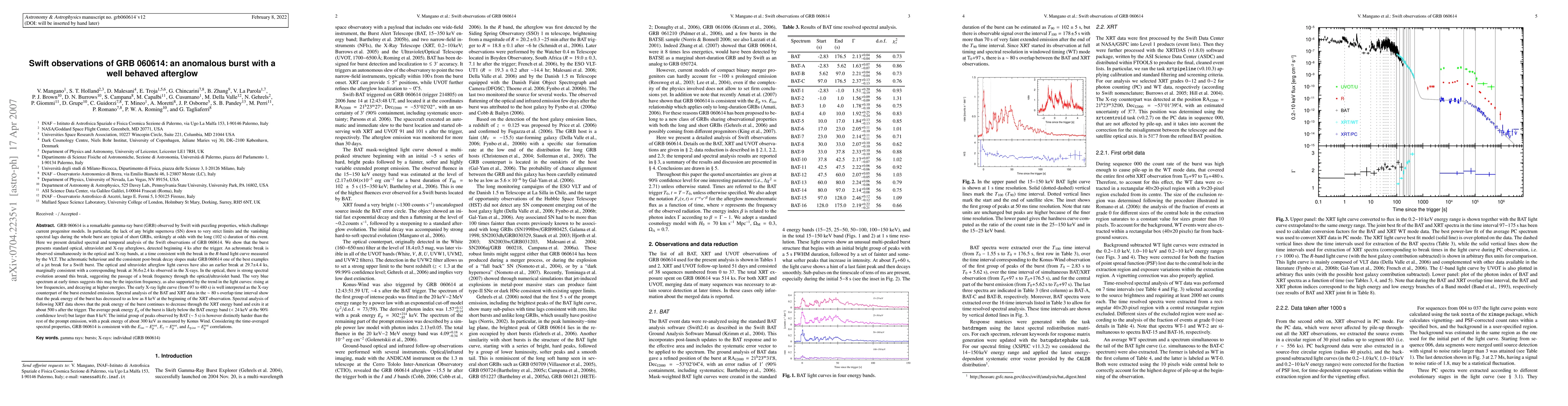 GRB 060614 is a remarkable GRB observed by Swift with puzzling properties, which challenge current progenitor models. The lack of any bright SN down to very strict limits and the vanishing spectral lags are typical of short GRBs, strikingly at odds with the long (102s) duration of this event. Here we present spectral and temporal analysis of the Swift observations. We show that the burst presents standard optical, UV and X-ray afterglows. An achromatic break is observed simultaneously in optical and X-rays, at a time consistent with the break in the R-band light curve measured by the VLT. The achromatic behaviour and the consistent post-break decay slopes make GRB 060614 one of the best examples of a jet break for a Swift burst. The optical, UV and X-rays afterglow light curves have also an earlier break at ~30 ks. In the optical, there is strong spectral evolution around this break, suggesting the passage of a break frequency through the optical/UV band. The very blue spectrum at early times and the trend in the light curves (rising at low frequencies, and decaying at higher energies) suggest this may be the injection frequency. The early X-ray light curve is well interpreted as the X-ray counterpart of the burst extended emission. Spectral analysis of BAT/XRT data in the 80s overlap time show that the Ep of the burst has decreased to as low as 8keV at the beginning of the XRT observation. The Ep continues to decrease through the XRT energy band and exits it at about 500s after the trigger. The average Ep of the burst is likely < 24 keV but larger than 8 keV. The initial peak observed by BAT is however distinctly harder than the rest with Ep ~300 keV as measured by Konus Wind. Considering the time-averaged spectral properties, GRB 060614 is consistent with the Eiso-Ep_rest, Egamma-Ep_rest, and Liso-Ep correlations.