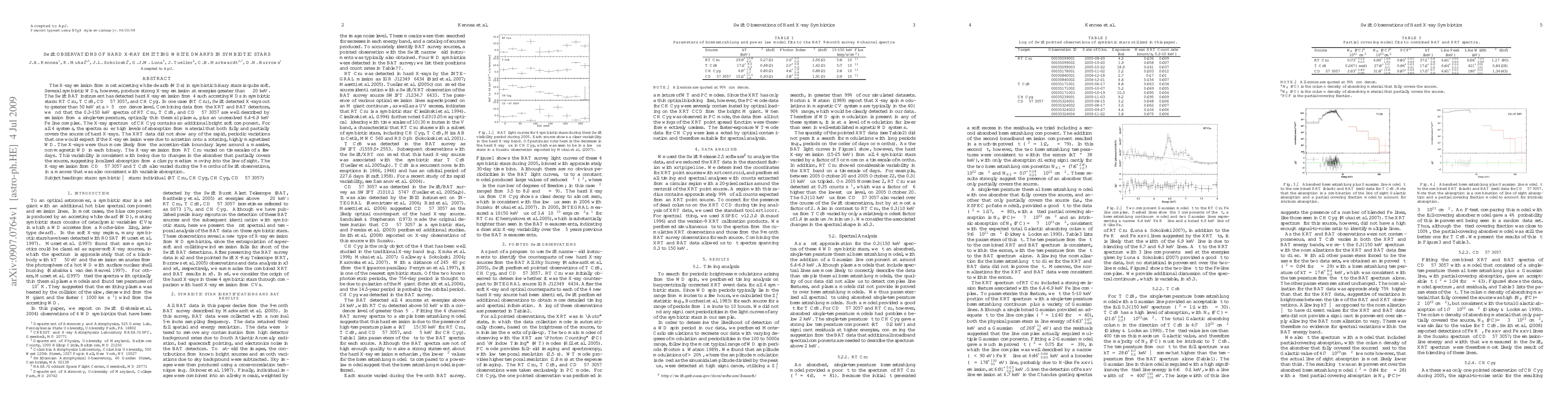 This paper reports on Swift observations of four symbiotic stars with accreting white dwarfs emitting hard X-rays, finding that their spectra are best explained by an accretion-disk boundary layer around non-magnetic WDs. The X-ray emission shows variability likely due to variable absorption from a clumpy medium.