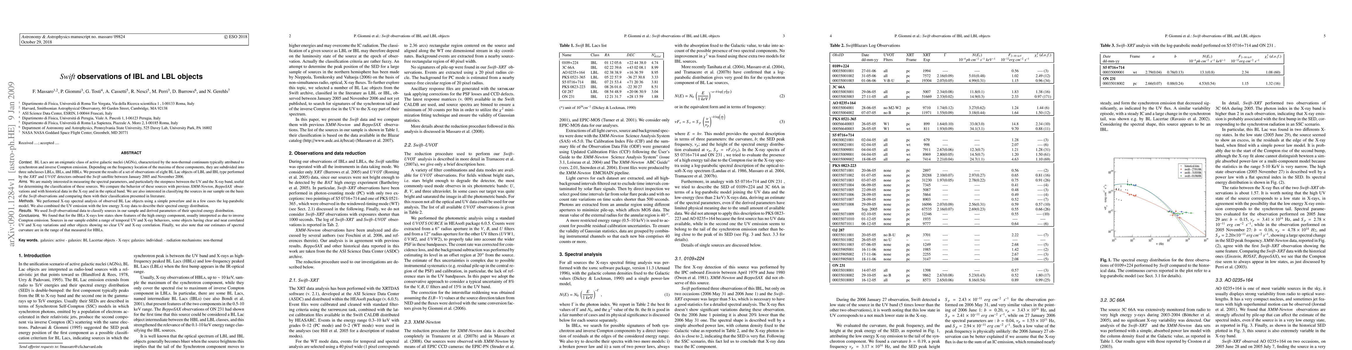 BL Lacs are an enigmatic class of active galactic nuclei (AGNs), characterized by the non-thermal continuum typically attributed to synchrotron and inverse Compton emission. Depending on the frequency location of the maxima of these components, they are subdivided into three subclasses LBLs, IBLs, and HBLs. We present the results of a set of observations of eight BL Lac objects of LBL and IBL type performed by the XRT and UVOT detectors onboard the Swift satellite between January 2005 and November 2006. We are mainly interested in measuring the spectral parameters, and particularly the steepness between the UV and the X-ray band, useful for determining the classification of these sources. We compare the behavior of these sources with previous XMM-Newton, BeppoSAX obser- vations and with historical data in the X-ray and in the optical band. We are also interested in classifying the sources in our sample on the basis of the observations and comparing them with their classification presented in literature. We performed X-ray spectral analysis of observed BL Lac objects using a simple powerlaw and in a few cases the log-parabolic model. We also combined the UV emission with the low energy X-ray data to We used observational data to classify sources in our sample and derived parameters of their spectral energy distribution. We found that for the IBLs X-rays low states show features of the high energy component, usually interpreted as due to inverse Compton emission. Sources in our sample exhibit a range of temporal UV and X-ray behaviors, some objects having clear and neat correlated UV and X-ray variations (e.g. ON231) and other objects showing no clear (e.g. AO 0235+164) UV and X-ray correlation. Finally, we also note that our estimates of spectral curvature are in the range of that measured for the HBLs.
