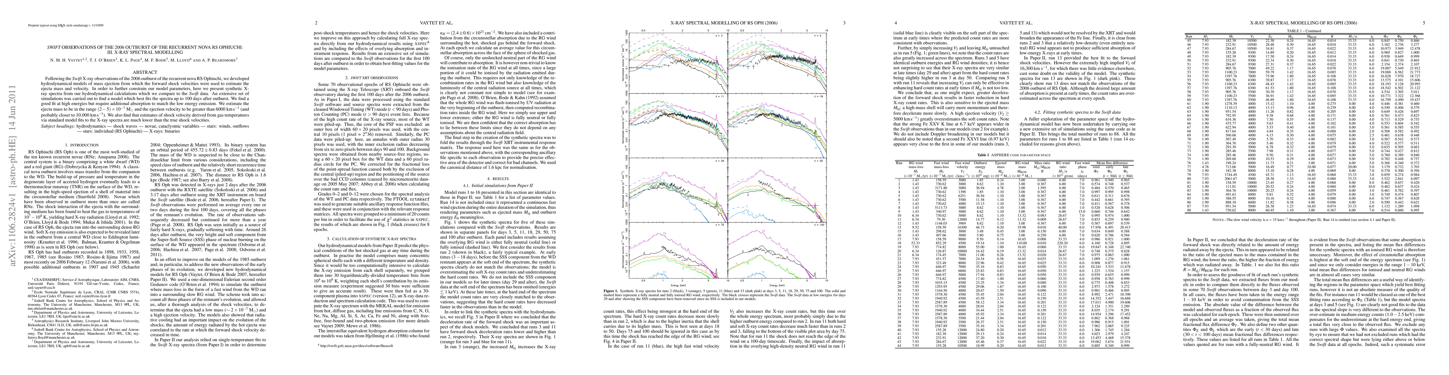This paper presents hydrodynamical models to simulate the 2006 outburst of RS Ophiuchi, estimating ejecta mass and velocity, and compares synthetic X-ray spectra to Swift data, finding a good fit at high energies but requiring additional absorption for low energy emission. The ejecta mass is estimated at (2-5) x 10^{-7} solar masses, and the ejection velocity is likely around 10,000 km/s.