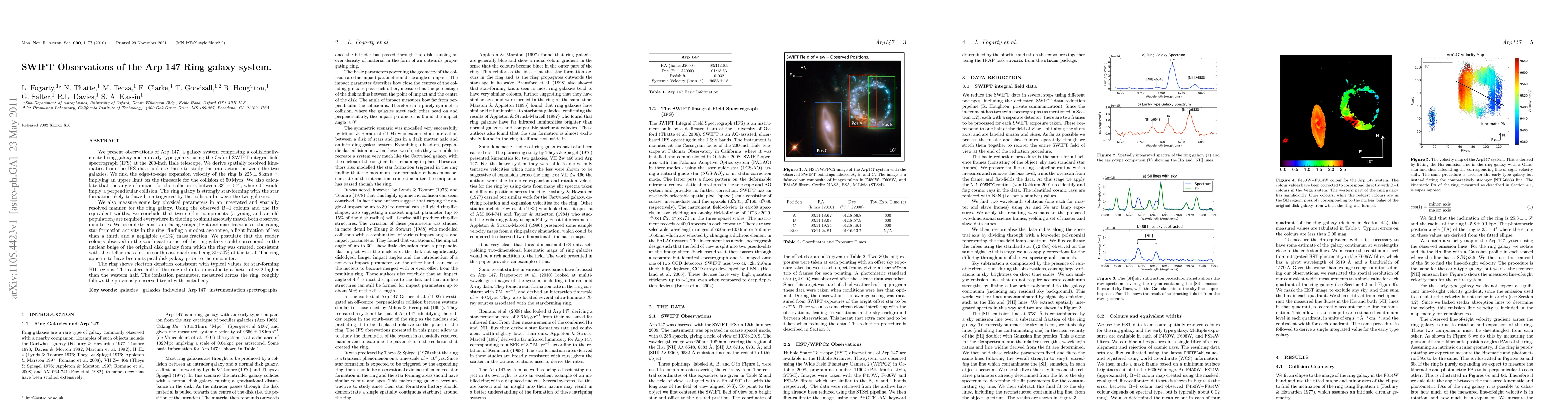 We present observations of Arp 147, a galaxy system comprising a collisionally-created ring galaxy and an early-type galaxy, using the Oxford SWIFT integral field spectrograph (IFS) at the 200-inch Hale telescope. We derive spatially resolved kinematics from the IFS data and use these to study the interaction between the two galaxies. We find the edge-to-edge expansion velocity of the ring is 225 +/- 8 km/s, implying an upper limit on the timescale for the collision of 50 Myrs. We also calculate that the angle of impact for the collision is between 33 degrees-54 degrees, where 0 degrees would imply a perpendicular collision. The ring galaxy is strongly star-forming with the star formation likely to have been triggered by the collision between the two galaxies. We measure some key physical parameters in an integrated and spatially resolved manner for the ring galaxy. Using observed B-I colours and the H-alpha equivalent widths, we conclude that two stellar components (a young and an old population) are required to simultaneously match both observed quantities. We constrain the age range, light and mass fractions of the young star formation in the ring, finding a modest age range, a light fraction of less than a third, and a negligible (<1%) mass fraction. We postulate that the redder colours observed in the SE corner of the ring galaxy could correspond to the nuclear bulge of the original disk galaxy from which the ring was created, consistent with the stellar mass in the SE quadrant being 30-50% of the total. The ring appears to have been a typical disk galaxy prior to the encounter. The ring shows electron densities consistent with typical values for star-forming HII regions. The eastern half of the ring exhibits a metallicity a factor of ~2 higher than the western half. The ionisation parameter, measured across the ring, roughly follows the previously observed trend with metallicity.