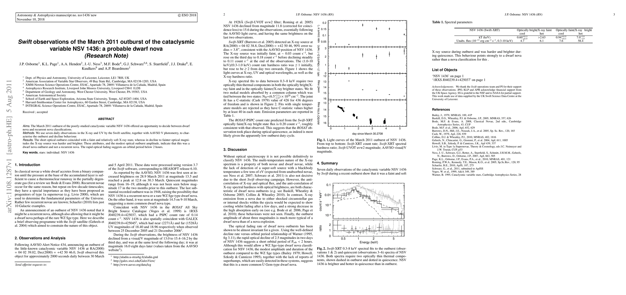 This research paper characterizes the March 2011 outburst of the cataclysmic variable NSV 1436, using Swift satellite observations and AAVSO V photometry, concluding it was a dwarf nova rather than a recurrent nova due to its short optical outburst and specific X-ray behavior. The rapid optical fading indicates an orbital period shorter than 2 hours.