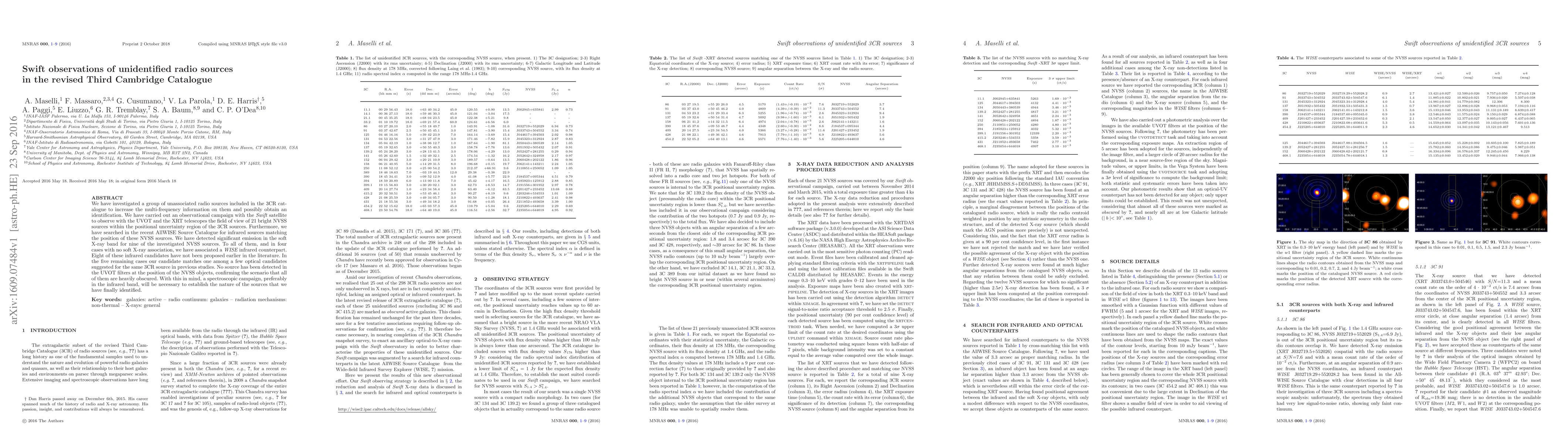 We have investigated a group of unassociated radio sources included in the 3CR cat- alogue to increase the multi-frequency information on them and possibly obtain an identification. We have carried out an observational campaign with the Swift satellite to observe with the UVOT and the XRT telescopes the field of view of 21 bright NVSS sources within the positional uncertainty region of the 3CR sources. Furthermore, we have searched in the recent AllWISE Source Catalogue for infrared sources matching the position of these NVSS sources. We have detected significant emission in the soft X-ray band for nine of the investigated NVSS sources. To all of them, and in four cases with no soft X-ray association, we have associated a WISE infrared counterpart. Eight of these infrared candidates have not been proposed earlier in the literature. In the five remaining cases our candidate matches one among a few optical candidates suggested for the same 3CR source in previous studies. No source has been detected in the UVOT filters at the position of the NVSS objects, confirming the scenario that all of them are heavily obscured. With this in mind, a spectroscopic campaign, preferably in the infrared band, will be necessary to establish the nature of the sources that we have finally identified.