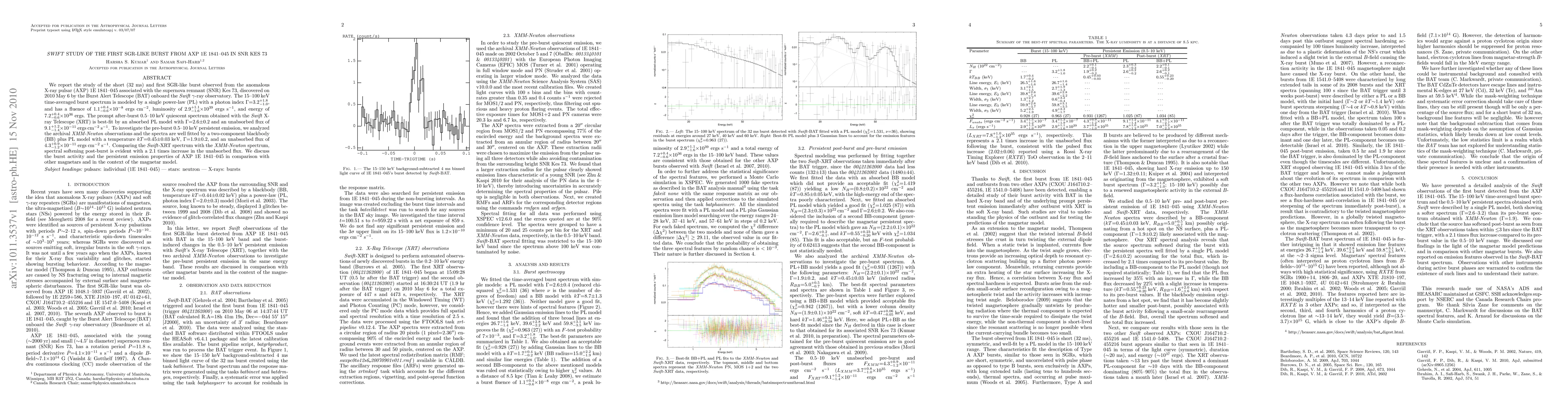 We report the study of the short (32 ms) and first SGR-like burst observed from the anomalous X-ray pulsar (AXP) 1E 1841-045 associated with the supernova remnant (SNR) Kes 73, discovered on 2010 May 6 by the Burst Alert Telescope (BAT) onboard the Swift gamma-ray observatory. The 15-100 keV time-averaged burst spectrum is modeled by a single power-law (PL) with a photon index Gamma=3.2$^{+1.8}_{-1.0}$, and has a fluence of 1.1$^{+0.4}_{-0.6}$$\times$10$^{-8}$ ergs cm$^{-2}$, luminosity of 2.9$^{+1.1}_{-1.6}$$\times$10$^{39}$ ergs s$^{-1}$, and energy of 7.2$^{+0.4}_{-0.6}$$\times$10$^{36}$ ergs. The prompt after-burst 0.5-10 keV quiescent spectrum obtained with the Swift X-ray Telescope (XRT) is best-fit by an absorbed PL model with Gamma=2.6$\pm$0.2 and an unabsorbed flux of 9.1$^{+1.2}_{-1.4}$$\times$10$^{-11}$ ergs cm$^{-2}$ s$^{-1}$. To investigate the pre-burst 0.5-10 keV persistent emission, we analyzed the archival XMM-Newton observations and the spectra are well fitted by a two-component blackbody (BB) plus PL model with a temperature kT=0.45$\pm$0.03 keV, Gamma=1.9$\pm$0.2, and an unabsorbed flux of 4.3$^{+0.9}_{-1.2}$$\times$10$^{-11}$ ergs cm$^{-2}$ s$^{-1}$. Comparing the Swift-XRT spectrum with the XMM-Newton spectrum, spectral softening post-burst is evident with a 2.1 times increase in the unabsorbed flux. We discuss the burst activity and the persistent emission properties of AXP 1E 1841-045 in comparison with other magnetars and in the context of the magnetar model.
