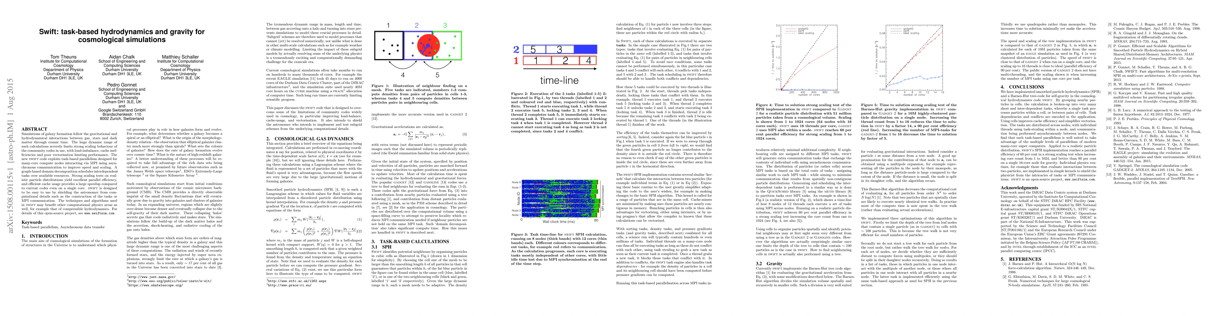 The SWIFT code enhances cosmological simulations by employing task-based parallelism and asynchronous MPI communication to achieve better scaling and performance. It offers excellent parallel efficiency and speed-up, making it user-friendly for astronomers.