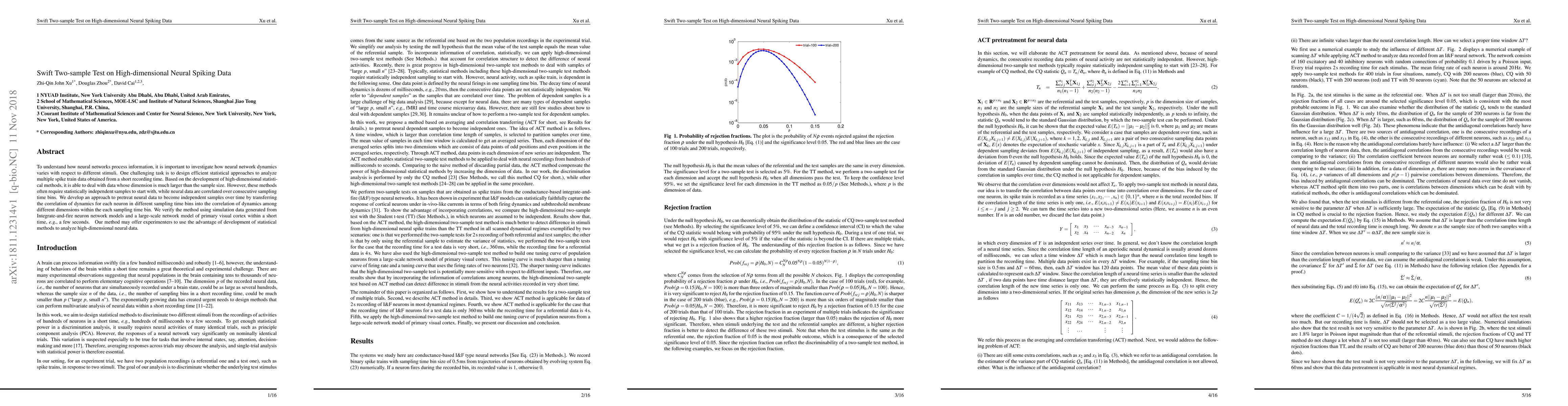 To understand how neural networks process information, it is important to investigate how neural network dynamics varies with respect to different stimuli. One challenging task is to design efficient statistical approaches to analyze multiple spike train data obtained from a short recording time. Based on the development of high-dimensional statistical methods, it is able to deal with data whose dimension is much larger than the sample size. However, these methods often require statistically independent samples to start with, while neural data are correlated over consecutive sampling time bins. We develop an approach to pretreat neural data to become independent samples over time by transferring the correlation of dynamics for each neuron in different sampling time bins into the correlation of dynamics among different dimensions within each sampling time bin. We verify the method using simulation data generated from Integrate-and-fire neuron network models and a large-scale network model of primary visual cortex within a short time, e.g., a few seconds. Our method may offer experimenters to use the advantage of the development of statistical methods to analyze high-dimensional neural data.