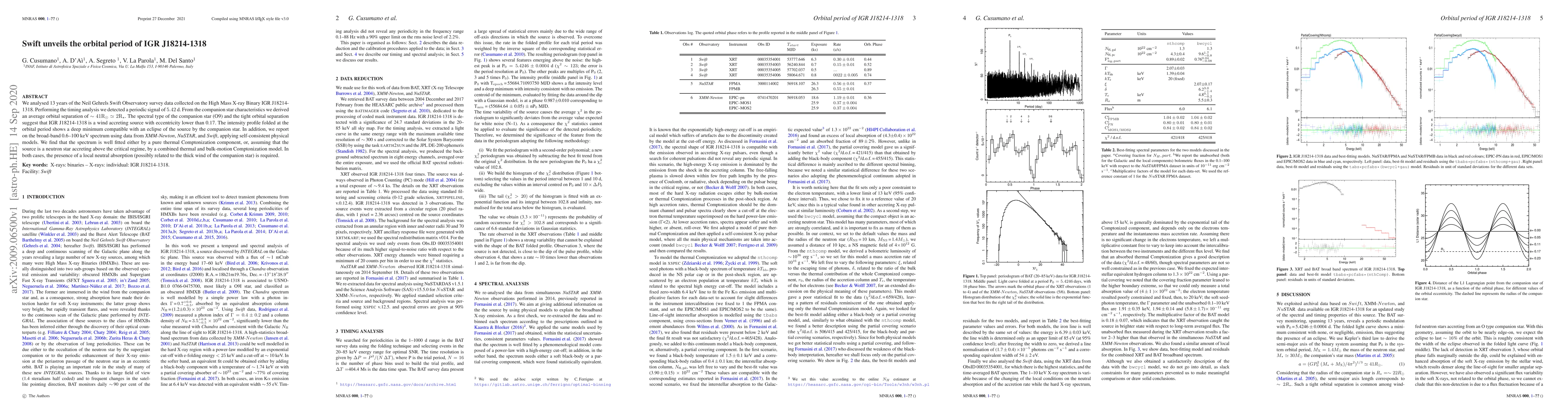 We analysed 13 years of the Neil Gehrels Swift Observatory survey data collected on the High Mass X-ray Binary IGR J18214-1318. Performing the timing analysis we detected a periodic signal of 5.42 d. From the companion star characteristics we derived an average orbital separation of $\sim 41 \rm R_{\odot}\simeq 2 R_{\star}$. The spectral type of the companion star (O9) and the tight orbital separation suggest that IGR~J18214-1318 is a wind accreting source with eccentricity lower than 0.17. The intensity profile folded at the orbital period shows a deep minimum compatible with an eclipse of the source by the companion star. In addition, we report on the broad-band 0.6--100 keV spectrum using data from XMM-Newton, NuSTAR, and Swift, applying self-consistent physical models. We find that the spectrum is well fitted either by a pure thermal Comptonization component, or, assuming that the source is a neutron star accreting above the critical regime, by a combined thermal and bulk-motion Comptonization model. In both cases, the presence of a local neutral absorption (possibly related to the thick wind of the companion star) is required.