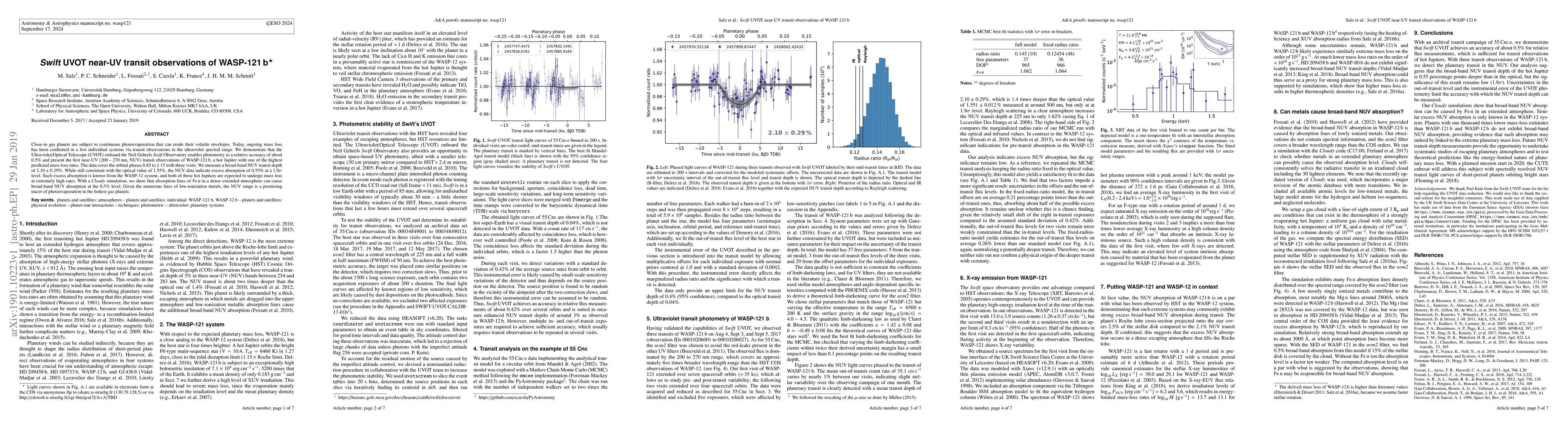 Close-in gas planets are subject to continuous photoevaporation that can erode their volatile envelopes. Today, ongoing mass loss has been confirmed in a few individual systems via transit observations in the ultraviolet spectral range. We demonstrate that the Ultraviolet/Optical Telescope (UVOT) onboard the Neil Gehrels Swift Observatory enables photometry to a relative accuracy of about 0.5% and present the first near-UV (200-270 nm, NUV) transit observations of WASP-121 b, a hot Jupiter with one of the highest predicted mass-loss rates. The data cover the orbital phases 0.85 to 1.15 with three visits. We measure a broad-band NUV transit depth of $2.10\pm0.29$%. While still consistent with the optical value of 1.55%, the NUV data indicate excess absorption of 0.55% at a 1.9$\sigma$ level. Such excess absorption is known from the WASP-12 system, and both of these hot Jupiters are expected to undergo mass loss at extremely high rates. With a CLOUDY simulation, we show that absorption lines of Fe II in a dense extended atmosphere can cause broad-band NUV absorption at the 0.5% level. Given the numerous lines of low-ionization metals, the NUV range is a promising tracer of photoevaporation in the hottest gas planets.