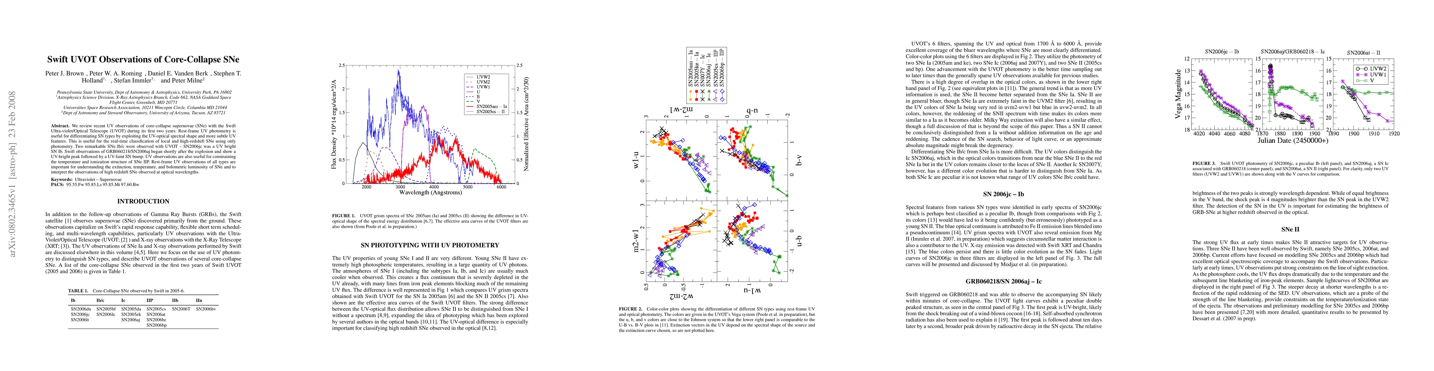 We review recent UV observations of core-collapse supernovae (SNe) with the Swift Ultra-violet/Optical Telescope (UVOT) during its first two years. Rest-frame UV photometry is useful for differentiating SN types by exploiting the UV-optical spectral shape and more subtle UV features. This is useful for the real-time classification of local and high-redshift SNe using only photometry. Two remarkable SNe Ib/c were observed with UVOT -- SN2006jc was a UV bright SN Ib. Swift observations of GRB060218/SN2006aj began shortly after the explosion and show a UV-bright peak followed by a UV-faint SN bump. UV observations are also useful for constraining the temperature and ionization structure of SNe IIP. Rest-frame UV observations of all types are important for understanding the extinction, temperature, and bolometric luminosity of SNe and to interpret the observations of high redshift SNe observed at optical wavelengths.