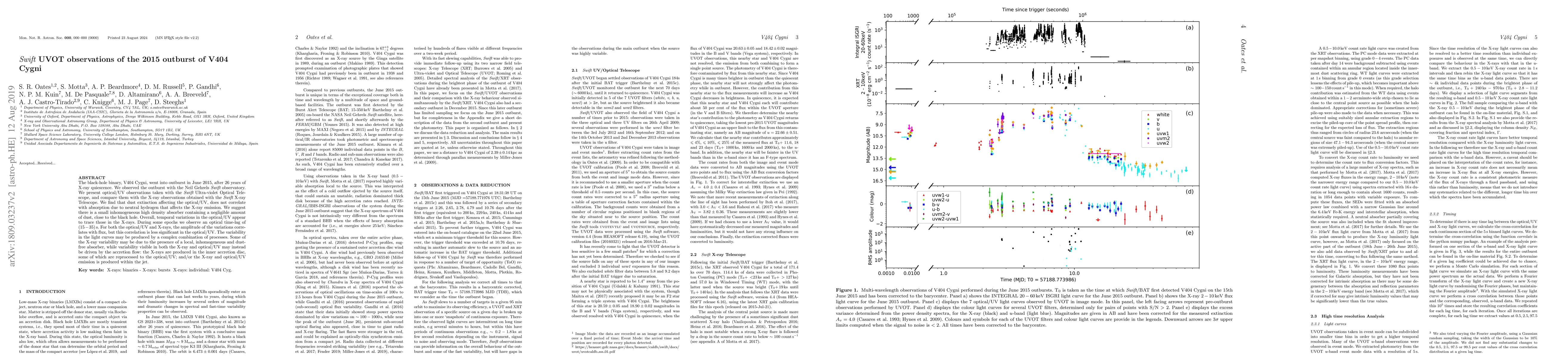 The black-hole binary, V404 Cygni, went into outburst in June 2015, after 26 years of X-ray quiescence. We observed the outburst with the Neil Gehrels Swift observatory. We present optical/UV observations taken with the Swift Ultra-violet Optical Telescope, and compare them with the X-ray observations obtained with the Swift X-ray Telescope. We find that dust extinction affecting the optical/UV, does not correlate with absorption due to neutral hydrogen that affects the X-ray emission. We suggest there is a small inhomogeneous high density absorber containing a negligible amount of dust, close to the black hole. Overall, temporal variations in the optical/UV appear to trace those in the X-rays. During some epochs we observe an optical time-lag of (15 - 35)s. For both the optical/UV and X-rays, the amplitude of the variations correlates with flux, but this correlation is less significant in the optical/UV. The variability in the light curves may be produced by a complex combination of processes. Some of the X-ray variability may be due to the presence of a local, inhomogeneous and dust-free absorber, while variability visible in both the X-ray and optical/UV may instead be driven by the accretion flow: the X-rays are produced in the inner accretion disc, some of which are reprocessed to the optical/UV; and/or the X-ray and optical/UV emission is produced within the jet.