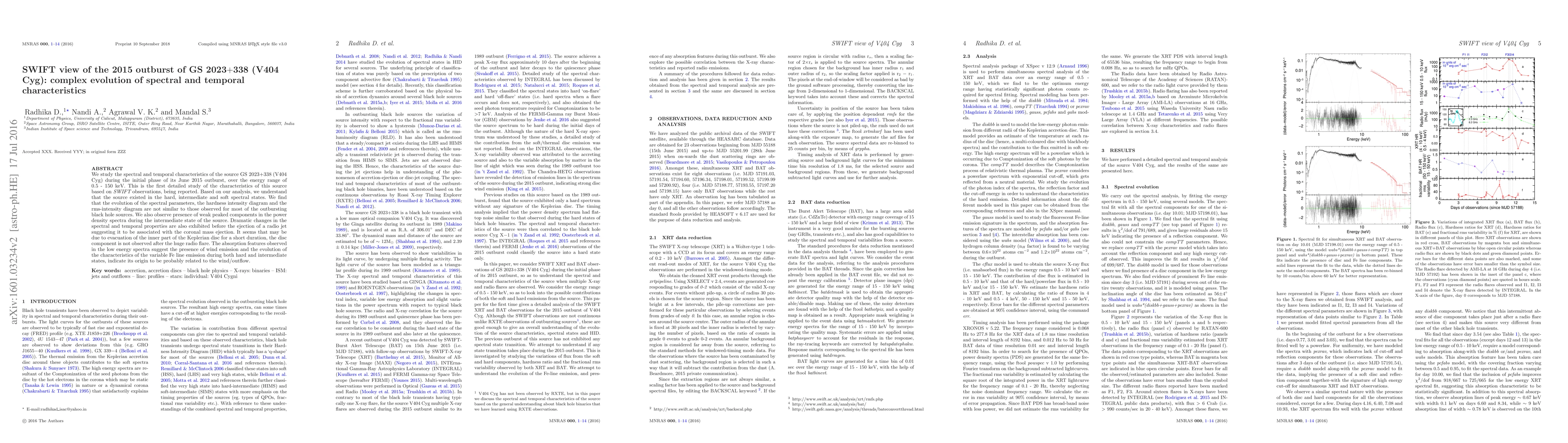 We study the spectral and temporal characteristics of the source GS 2023$+$338 (V404 Cyg) during the initial phase of its June 2015 outburst, over the energy range of 0.5 - 150 keV. This is the first detailed study of the characteristics of this source based on {\it SWIFT} observations, being reported. Based on our analysis, we understand that the source existed in the hard, intermediate and soft spectral states. We find that the evolution of the spectral parameters, the hardness intensity diagram and the rms-intensity diagram are not similar to those observed for most of the outbursting black hole sources. We also observe presence of weak peaked components in the power density spectra during the intermediate state of the source. Dramatic changes in the spectral and temporal properties are also exhibited before the ejection of a radio jet suggesting it to be associated with the coronal mass ejection. It seems that may be due to evacuation of the inner part of the Keplerian disc for a short duration, the disc component is not observed after the huge radio flare. The absorption features observed in the low energy spectra suggest the presence of wind emission and the evolution of the characteristics of the variable Fe line emission during both hard and intermediate states, indicate its origin to be probably related to the wind/outflow.
