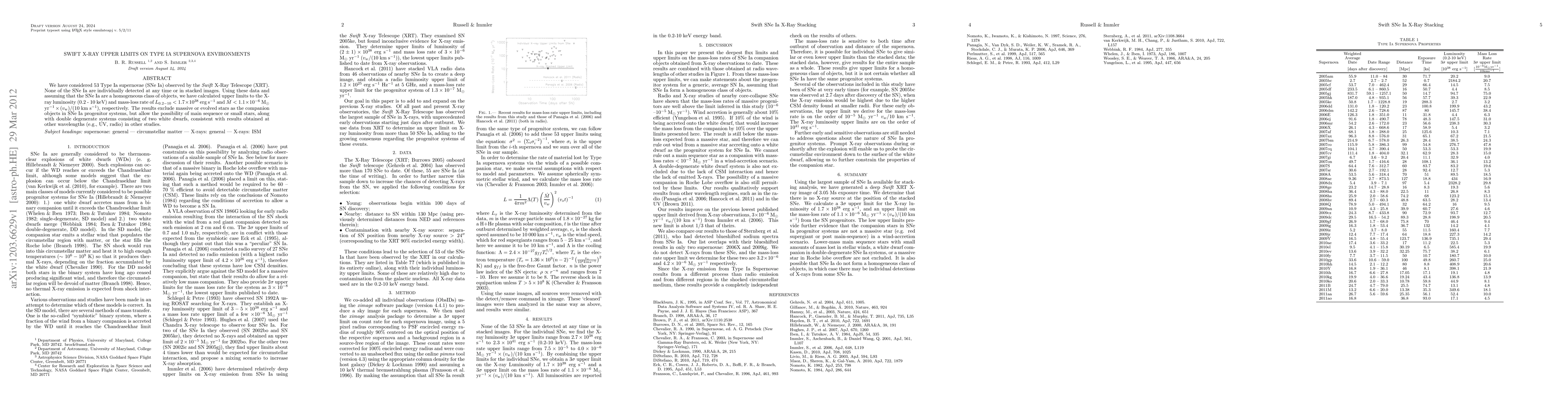 New Swift X-Ray observations of 53 Type Ia supernovae set upper limits on their X-ray luminosity and mass-loss rates, excluding massive stars as progenitor systems and allowing for smaller companion objects or double degenerate white dwarf pairs.