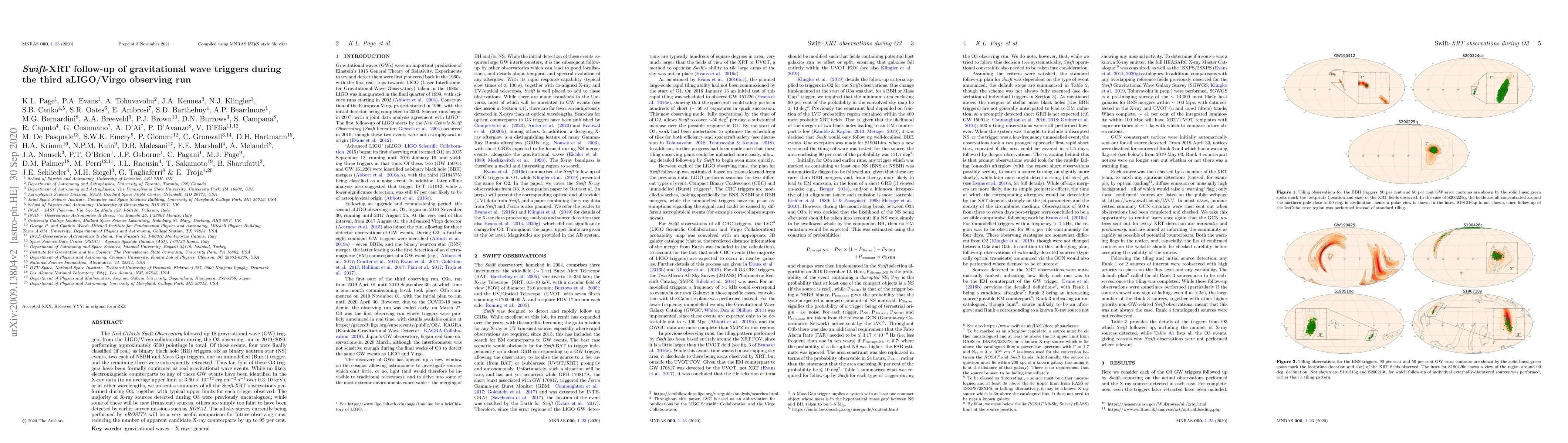 The Neil Gehrels Swift Observatory followed up 18 gravitational wave triggers from the LIGO/Virgo collaboration during the O3 run, identifying four confirmed events and no likely electromagnetic counterparts. The majority of detected X-ray sources were previously uncatalogued, with future eROSITA surveys expected to reduce false candidates significantly.