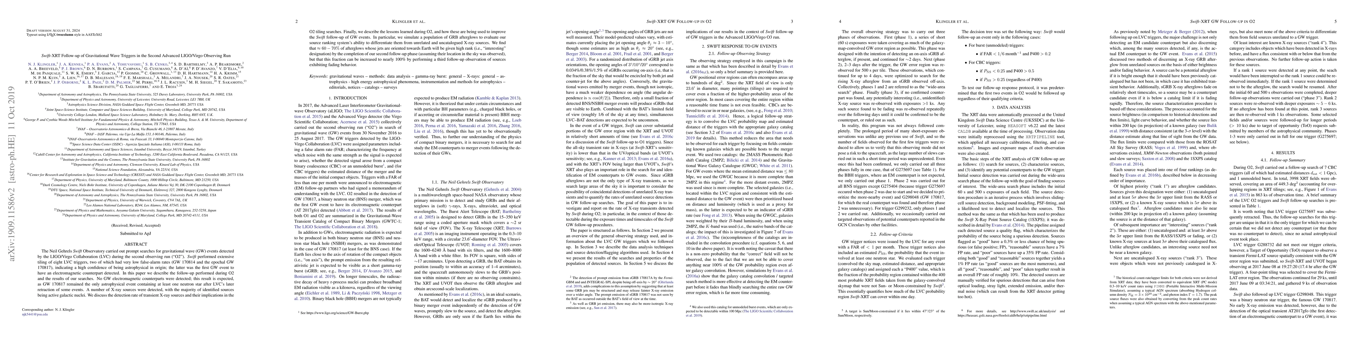 This paper details the Swift Observatory's follow-up observations of gravitational wave (GW) triggers during the second Advanced LIGO/Virgo observing run (O2), finding no electromagnetic counterparts but detecting numerous X-ray sources, mostly active galactic nuclei. The study highlights improvements in follow-up strategies and source ranking systems to better identify potential GW afterglows.