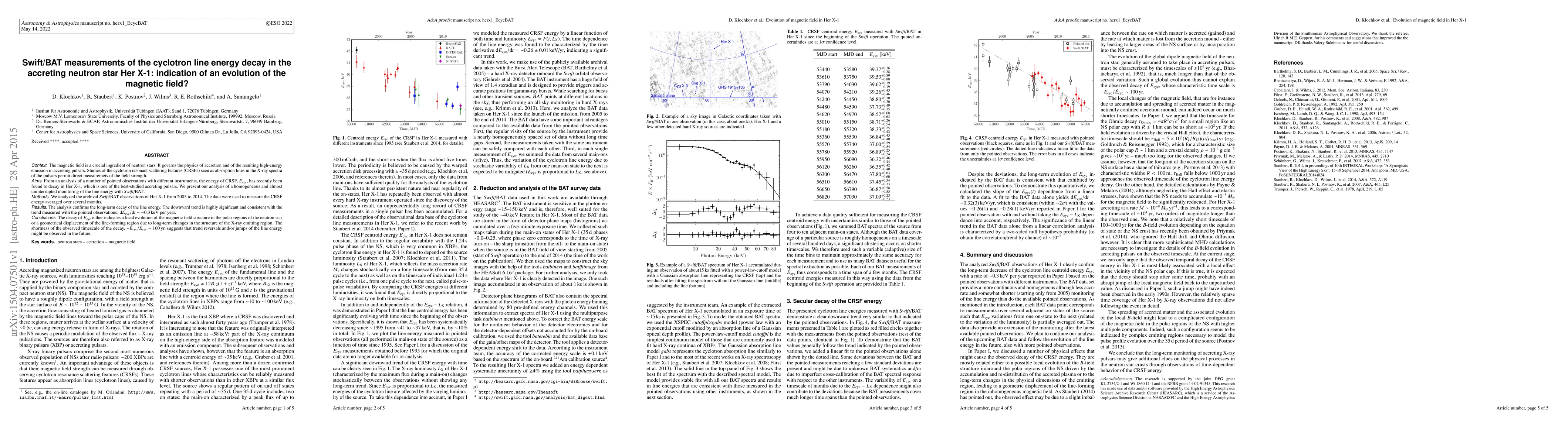 The Swift/BAT observations of Her X-1 reveal a significant long-term decay in the cyclotron line energy, suggesting either a magnetic field evolution or structural changes in the X-ray emitting region. This decay trend may indicate future trend reversals or jumps in the line energy.
