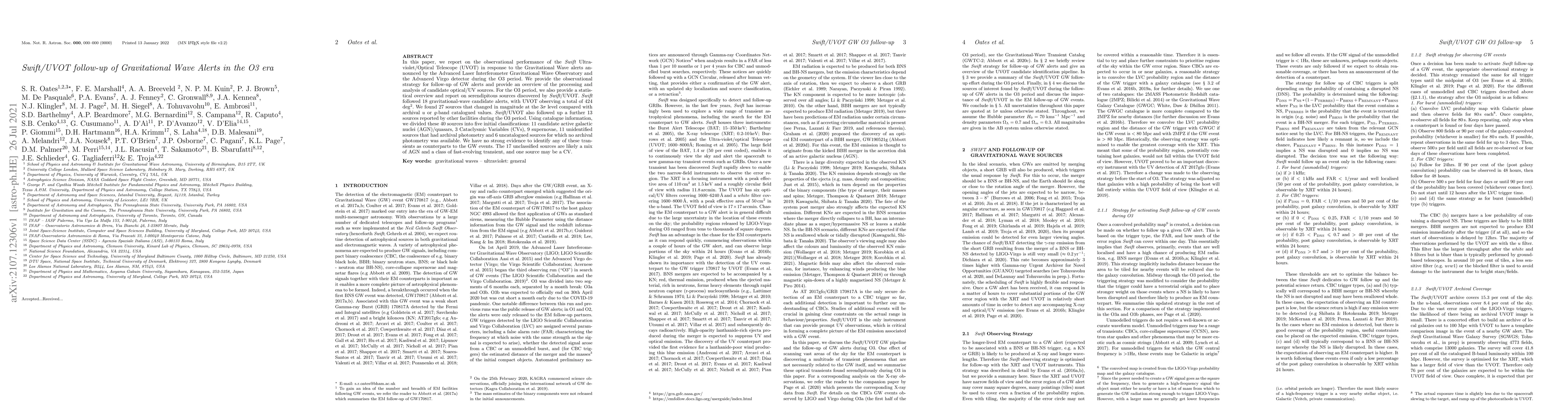 This paper details Swift/UVOT's follow-up observations of 18 gravitational wave alerts during the O3 era, covering 424 deg^2 and identifying 27 variable sources. Despite classifying 40 sources into AGN, CVs, supernovae, and others, no strong evidence links any to the GW events.
