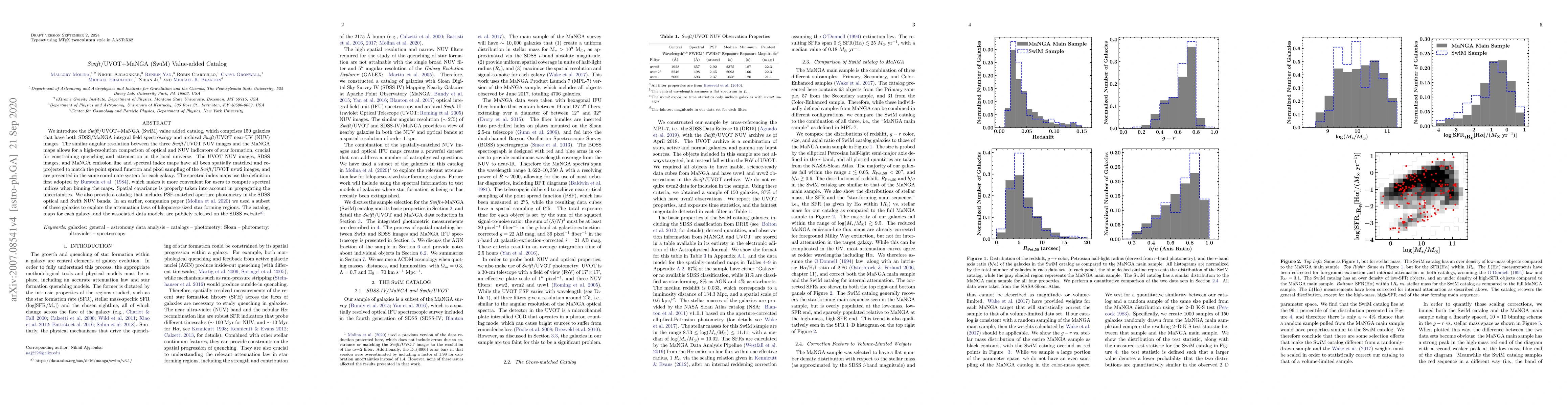 The Swift/UVOT+MaNGA (SwiM) value-added catalog combines SDSS/MaNGA spectroscopy with Swift/UVOT near-UV images for 150 galaxies, enabling high-resolution comparisons of optical and NUV star formation indicators. The catalog includes spatially matched and re-projected data, PSF-matched photometry, and is publicly available for studying quenching and attenuation in the local universe.