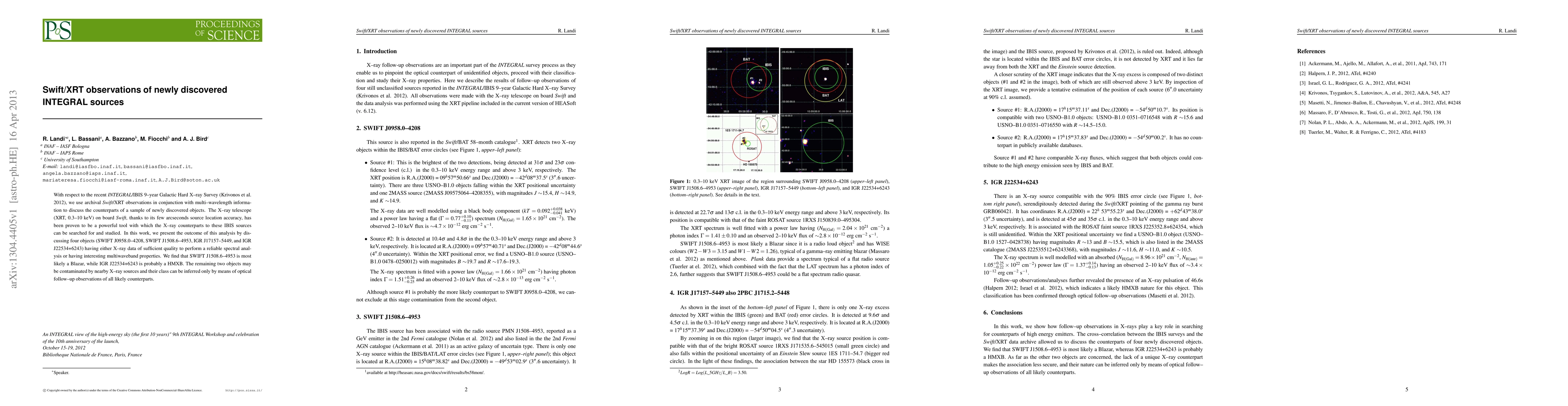 This research uses Swift/XRT observations to identify and analyze X-ray counterparts of newly discovered INTEGRAL sources, focusing on four objects with significant spectral or multiwaveband properties. SWIFT J1508.6-4953 is identified as a Blazar, and IGR J22534+6243 as a High-Mass X-ray Binary (HMXB), while the classification of the other two objects remains uncertain due to potential contamination from nearby X-ray sources.