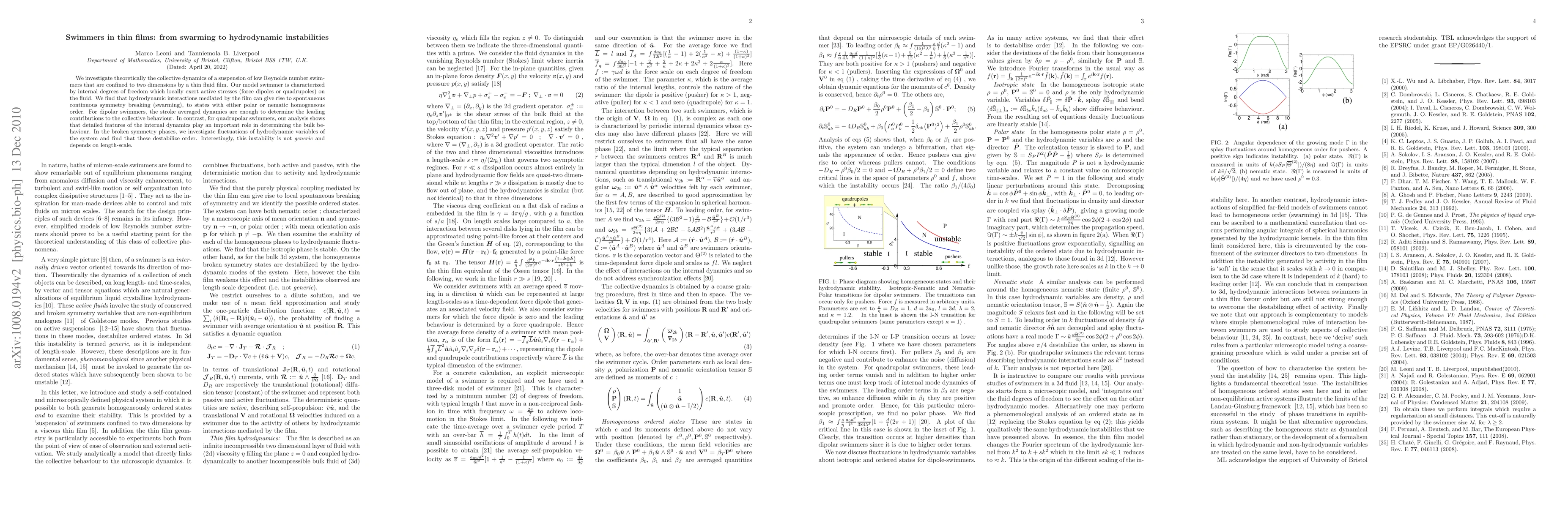This paper theoretically explores the collective dynamics of low Reynolds number swimmers in thin fluid films, revealing how hydrodynamic interactions can lead to swarming and different types of order. It highlights the differing roles of stroke dynamics in dipolar versus quadrupolar swimmers and identifies length-scale dependent hydrodynamic instabilities that destabilize order in these swarms.