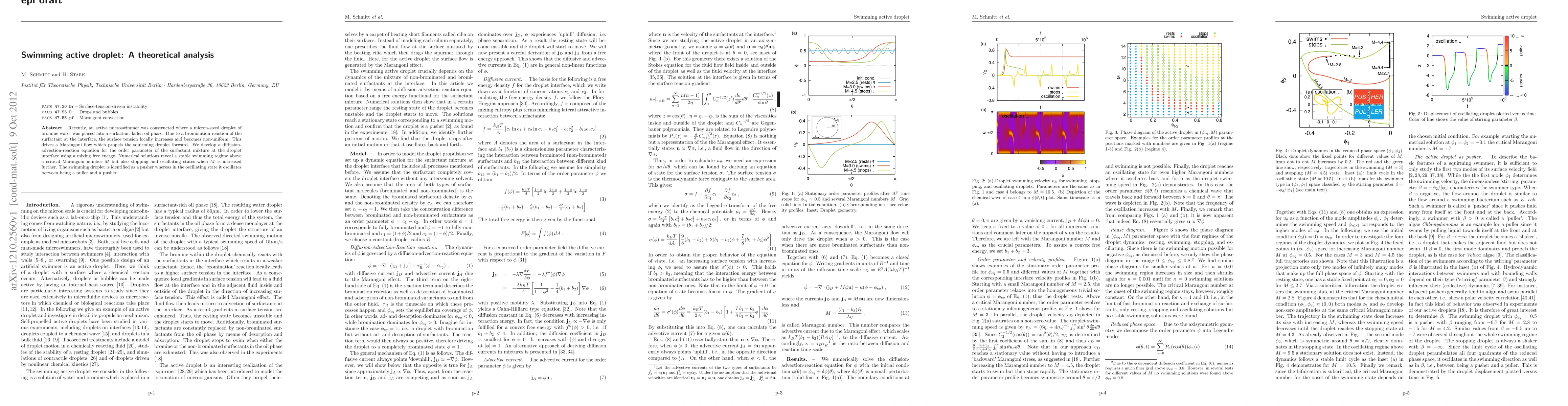 Recently, an active microswimmer was constructed where a micron-sized droplet of bromine water was placed into a surfactant-laden oil phase. Due to a bromination reaction of the surfactant at the interface, the surface tension locally increases and becomes non-uniform. This drives a Marangoni flow which propels the squirming droplet forward. We develop a diffusion-advection-reaction equation for the order parameter of the surfactant mixture at the droplet interface using a mixing free energy. Numerical solutions reveal a stable swimming regime above a critical Marangoni number M but also stopping and oscillating states when M is increased further. The swimming droplet is identified as a pusher whereas in the oscillating state it oscillates between being a puller and a pusher.