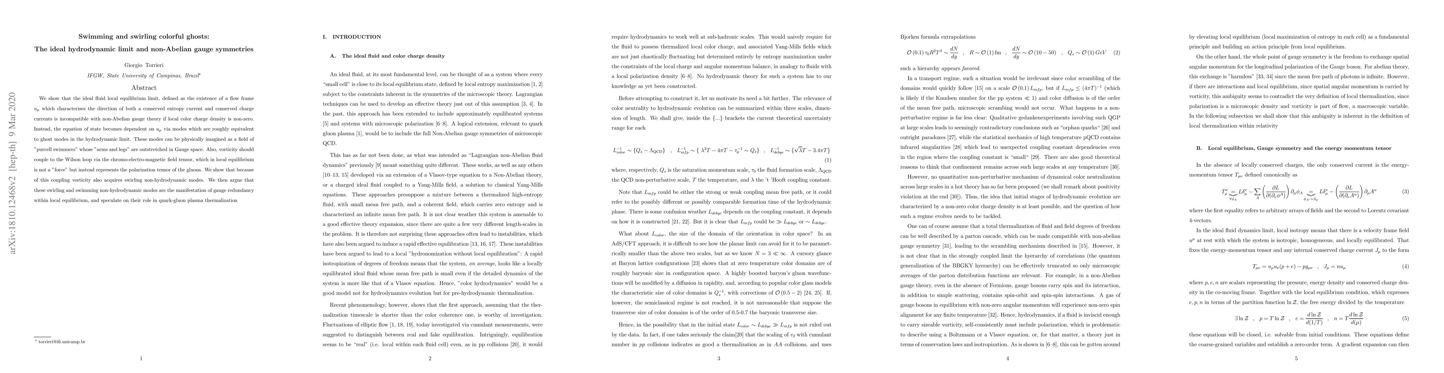 We show that the ideal fluid limit, defined as the existance of a flow frame $u_\mu$ with respect to which the fluid is homogeneus and isotropic, and the consequent independence of the equation of state on $u_\mu$, is incompatible with non-Abelian gauge theory. Instead, the equation of state becomes dependent on $u_\mu$ via modes which are roughly equivalent to ghost modes in the hydrodynamic limit. These modes can be physically imagined as a field of 'purcell swimmers' whose 'arms and legs' are outstretched in Gauge space. Also, vorticity should couple to the Wilson loop via the chromo-electro-magnetic field tensor, which in this limit is not a 'force' but instead represents the polarization tensor of the gluons. We show that because of this coupling vorticity also aquires swirling non-hydrodynamic modes. We then argue that these swirling and swimming non-hydodynamic modes are the manifestation of gauge redunancy within local equilibrium, and speculate on their role in quark-gluon plasma thermalization
