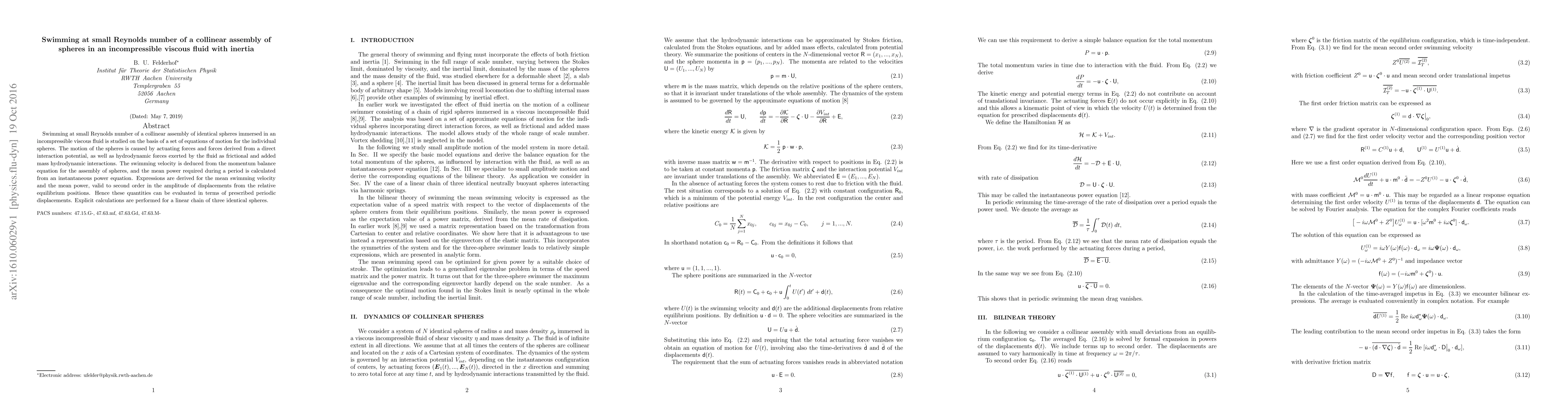 Swimming at small Reynolds number of a linear assembly of identical spheres immersed in a viscous fluid is studied on the basis of a set of equations of motion for the individual spheres. The motion of the spheres is caused by actuating forces and forces derived from a direct interaction potential, as well as hydrodynamic forces exerted by the fluid as frictional and added mass hydrodynamic interactions. The swimming velocity is deduced from the momentum balance equation for the assembly of spheres, and the mean power required during a period is calculated from an instantaneous power equation. Expressions are derived for the mean swimming velocity and the mean power, valid to second order in the amplitude of displacements from the relative equilibrium positions. Hence these quantities can be evaluated in terms of prescribed periodic displacements. Explicit calculations are performed for a linear chain of three identical spheres.