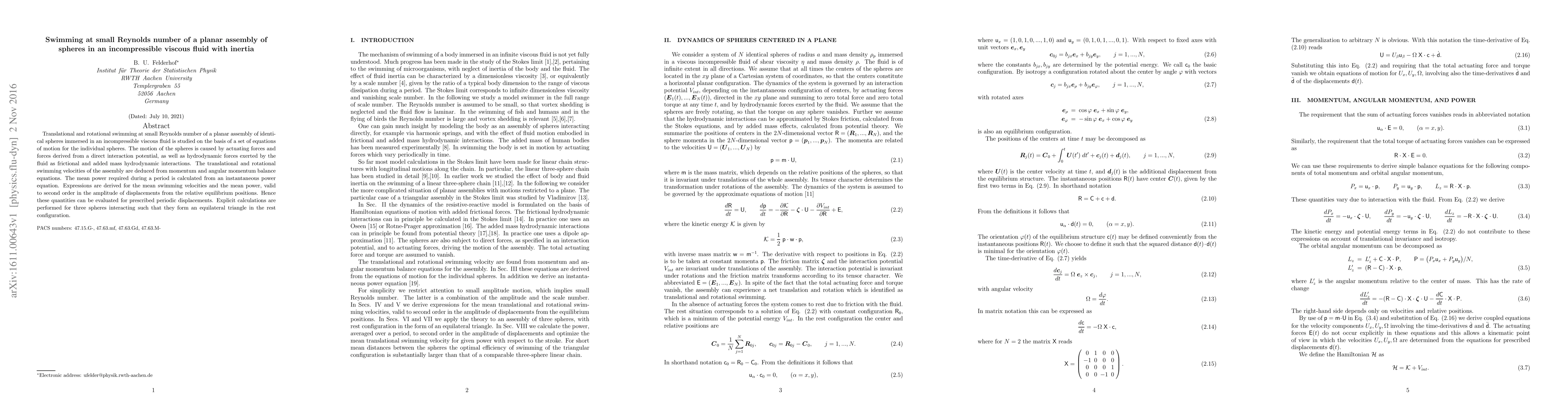 Translational and rotational swimming at small Reynolds number of a planar assembly of identical spheres immersed in an incompressible viscous fluid is studied on the basis of a set of equations of motion for the individual spheres. The motion of the spheres is caused by actuating forces and forces derived from a direct interaction potential, as well as hydrodynamic forces exerted by the fluid as frictional and added mass hydrodynamic interactions. The translational and rotational swimming velocities of the assembly are deduced from momentum and angular momentum balance equations. The mean power required during a period is calculated from an instantaneous power equation. Expressions are derived for the mean swimming velocities and the power, valid to second order in the amplitude of displacements from the relative equilibrium positions. Hence these quantities can be evaluated for prescribed periodic displacements. Explicit calculations are performed for three spheres interacting such that they form an equilateral triangle in the rest configuration.