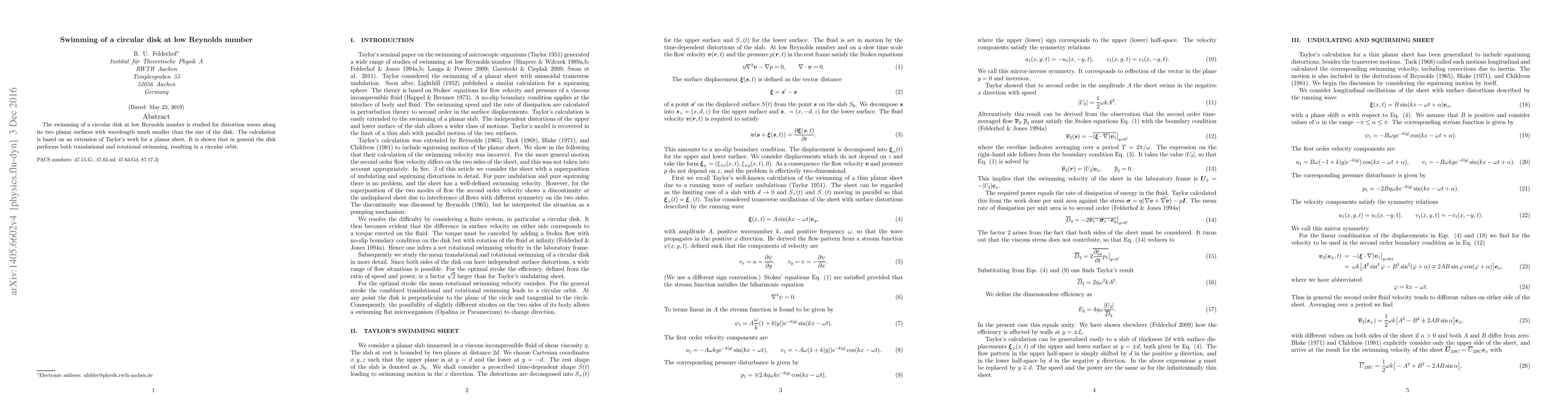 The research extends Taylor's work on a planar sheet to study the swimming of a circular disk at low Reynolds numbers, considering distortion waves along its surfaces.