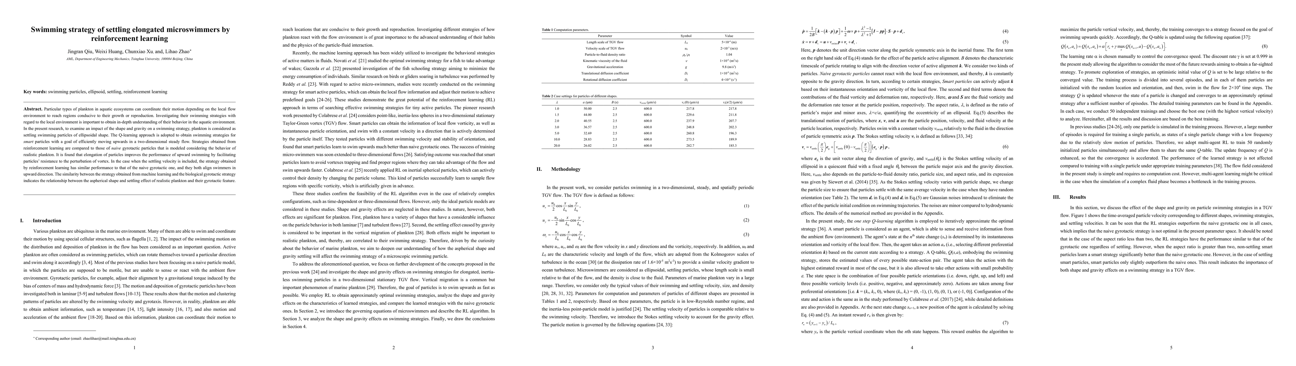 Particular types of plankton in aquatic ecosystems can coordinate their motion depending on the local flow environment to reach regions conducive to their growth or reproduction. Investigating their swimming strategies with regard to the local environment is important to obtain in-depth understanding of their behavior in the aquatic environment. In the present research, to examine an impact of the shape and gravity on a swimming strategy, plankton is considered as settling swimming particles of ellipsoidal shape. The Q-learning approach is adopted to obtain swimming strategies for smart particles with a goal of efficiently moving upwards in a two-dimensional steady flow. Strategies obtained from reinforcement learning are compared to those of naive gyrotactic particles that is modeled considering the behavior of realistic plankton. It is found that elongation of particles improves the performance of upward swimming by facilitating particles' resistance to the perturbation of vortex. In the case when the settling velocity is included, the strategy obtained by reinforcement learning has similar performance to that of the naive gyrotactic one, and they both align swimmers in upward direction. The similarity between the strategy obtained from machine learning and the biological gyrotactic strategy indicates the relationship between the aspherical shape and settling effect of realistic plankton and their gyrotactic feature.