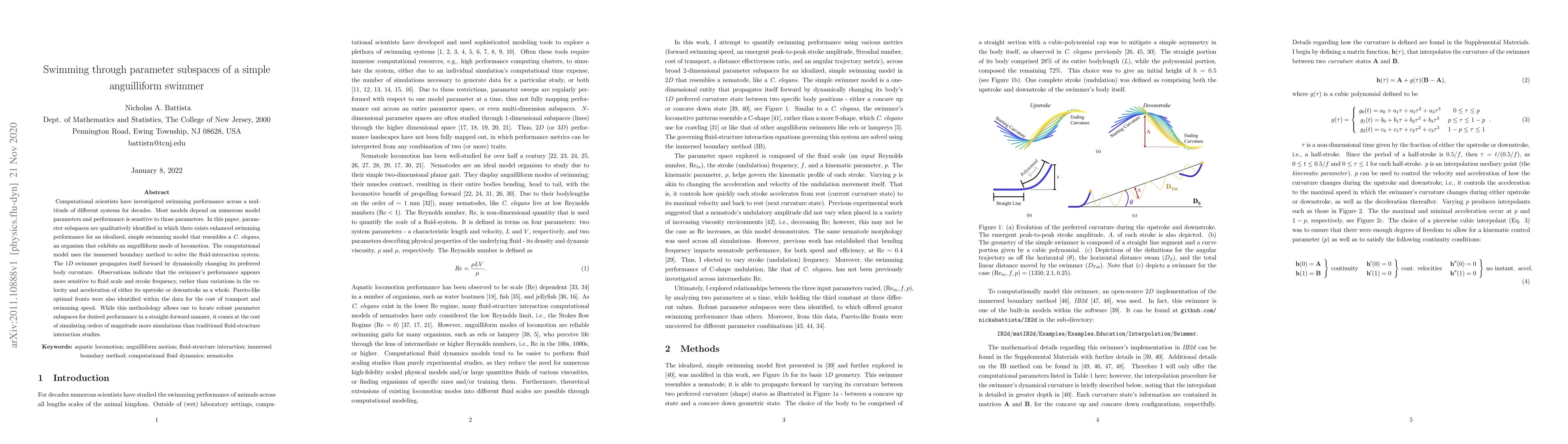 Researchers identified parameter subspaces that enhance swimming performance in a simple anguilliform swimmer model, with fluid scale and stroke frequency being key factors. This approach allows for efficient simulation of optimal parameters, but requires significantly more computational power than traditional methods.