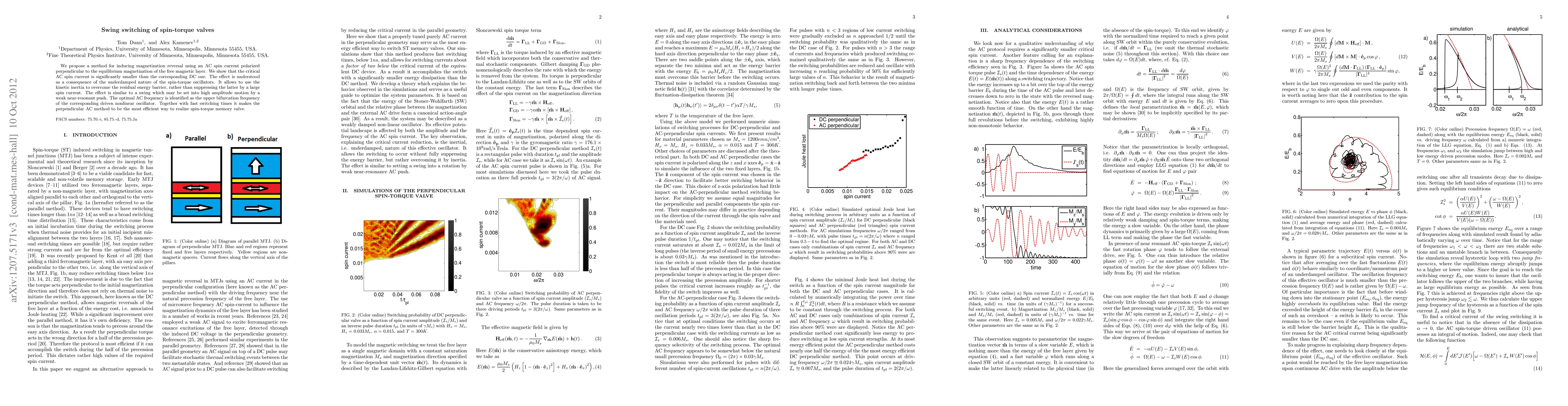 We propose a method for inducing magnetization reversal using an AC spin current polarized perpendicular to the equilibrium magnetization of the free magnetic layer. We show that the critical AC spin current is significantly smaller than the corresponding DC one. The effect is understood as a consequence of the underdamped nature of the spin-torque oscillators. It allows to use the kinetic inertia to overcome the residual energy barrier, rather than suppressing the latter by a large spin current. The effect is similar to a swing which may be set into high amplitude motion by a weak near-resonant push. The optimal AC frequency is identified as the upper bifurcation frequency of the corresponding driven nonlinear oscillator. Together with fast switching times it makes the perpendicular AC method to be the most efficient way to realize spin-torque memory valve.