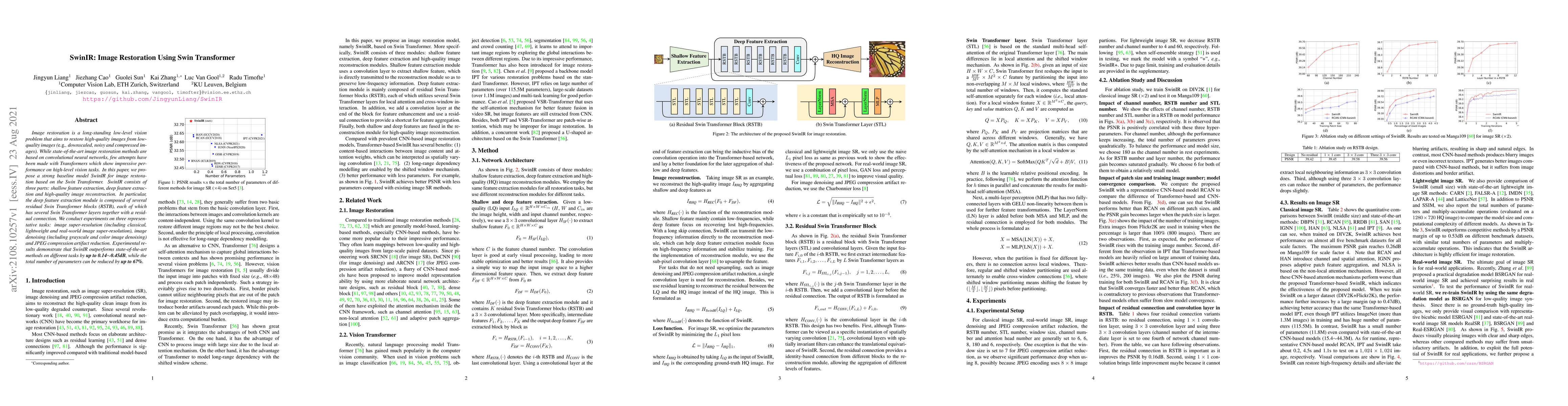 Image restoration is a long-standing low-level vision problem that aims to restore high-quality images from low-quality images (e.g., downscaled, noisy and compressed images). While state-of-the-art image restoration methods are based on convolutional neural networks, few attempts have been made with Transformers which show impressive performance on high-level vision tasks. In this paper, we propose a strong baseline model SwinIR for image restoration based on the Swin Transformer. SwinIR consists of three parts: shallow feature extraction, deep feature extraction and high-quality image reconstruction. In particular, the deep feature extraction module is composed of several residual Swin Transformer blocks (RSTB), each of which has several Swin Transformer layers together with a residual connection. We conduct experiments on three representative tasks: image super-resolution (including classical, lightweight and real-world image super-resolution), image denoising (including grayscale and color image denoising) and JPEG compression artifact reduction. Experimental results demonstrate that SwinIR outperforms state-of-the-art methods on different tasks by $\textbf{up to 0.14$\sim$0.45dB}$, while the total number of parameters can be reduced by $\textbf{up to 67%}$.