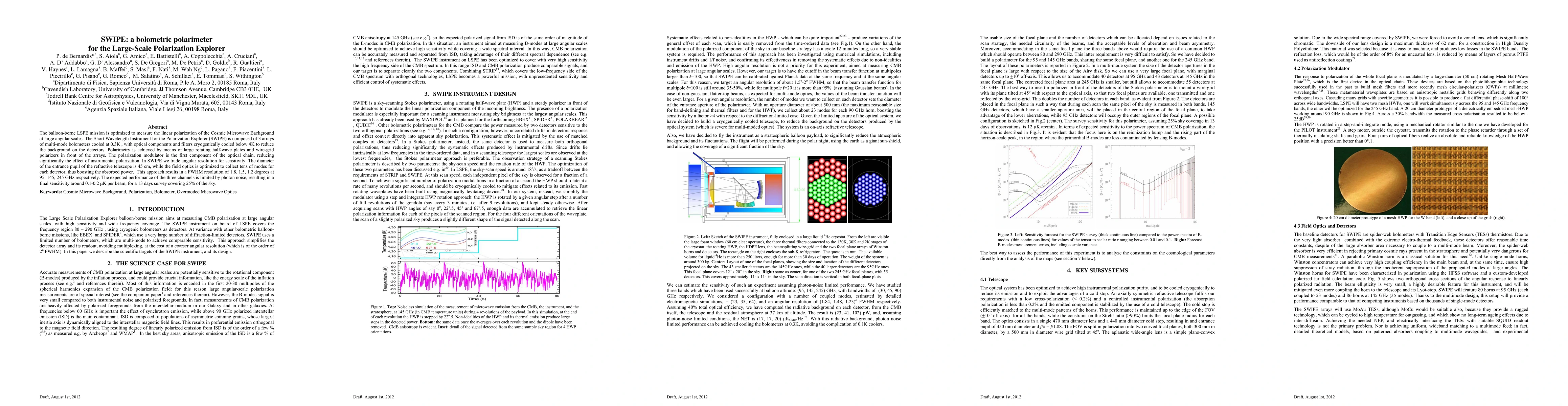 SWIPE is a bolometric polarimeter designed for the LSPE mission to measure the linear polarization of the Cosmic Microwave Background at large angular scales. It achieves high sensitivity by using multi-mode bolometers and large rotating half-wave plates, resulting in a final sensitivity of 0.1-0.2 uK per beam over a 13-day survey.