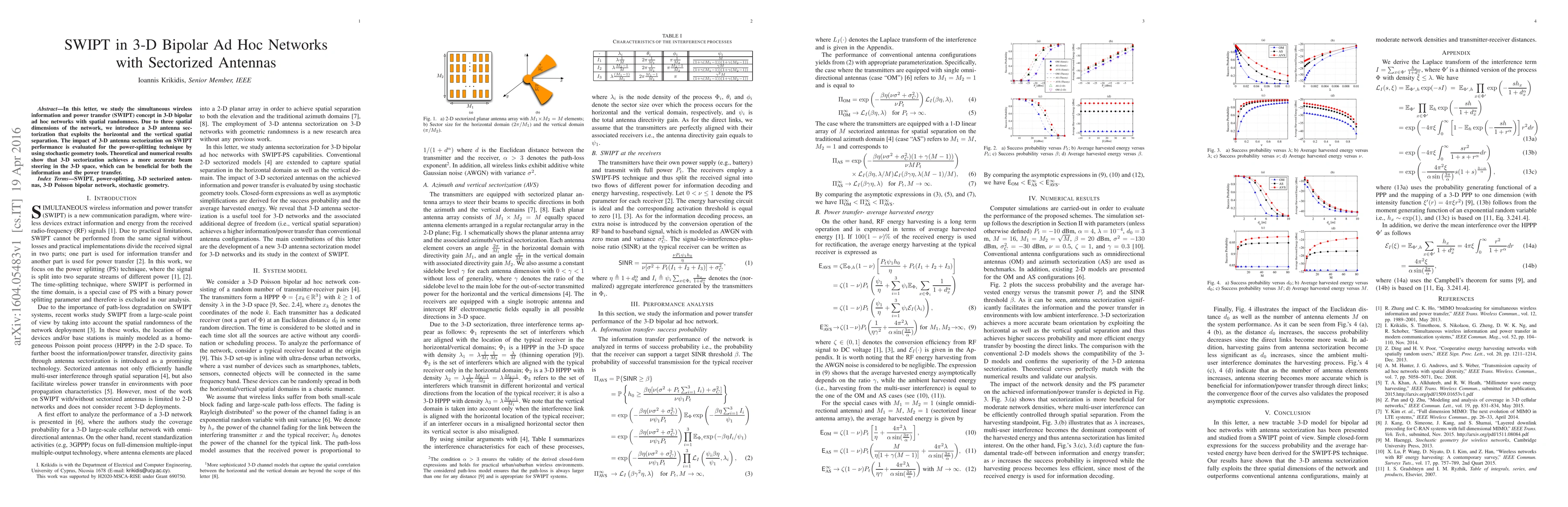 This paper investigates the SWIPT concept in 3-D bipolar ad hoc networks utilizing sectorized antennas to exploit spatial separation. It evaluates the impact of 3-D antenna sectorization on SWIPT performance using stochastic geometry, demonstrating improved beam steering and enhanced information and power transfer.