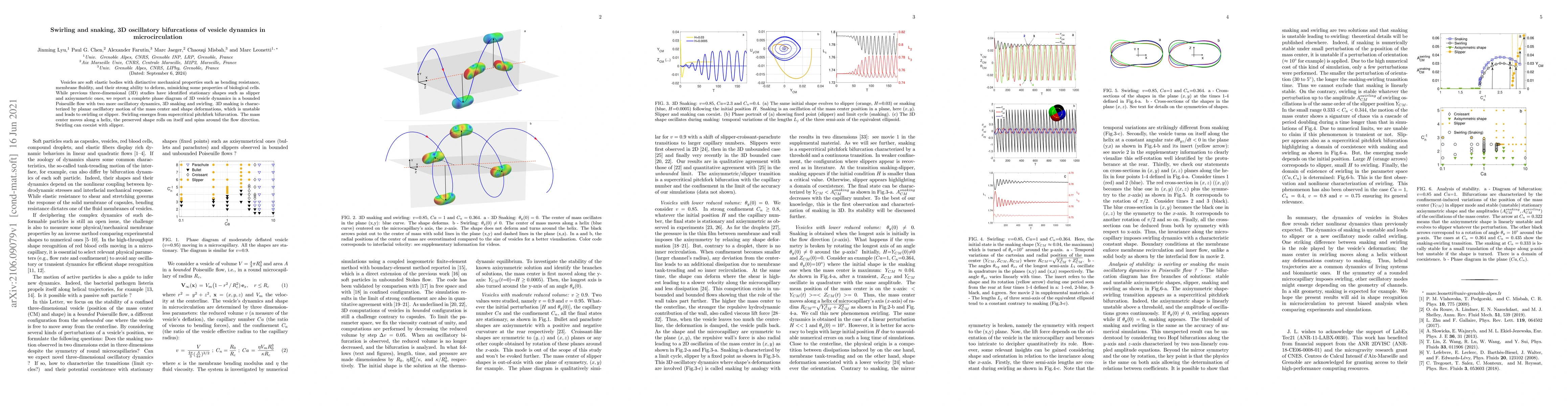 Researchers studied 3D vesicle dynamics in microcirculation and discovered two new oscillatory behaviors: snaking and swirling. These shapes emerge from a supercritical pitchfork bifurcation and can coexist with each other and a stationary slipper shape.