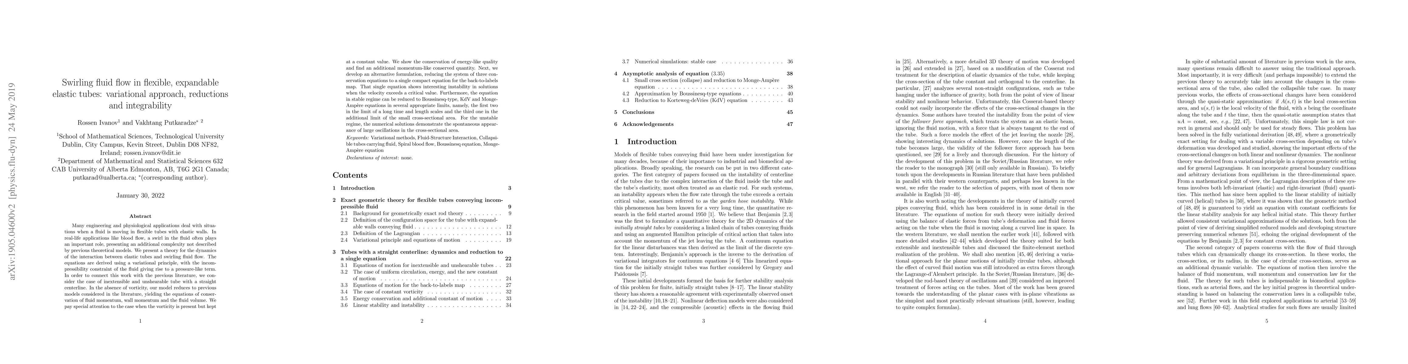 This paper presents a variational theory for fluid dynamics in flexible, expandable elastic tubes, focusing on the interaction between fluid and elastic structures. The equations derived reduce to known models in the absence of vorticity, and a single compact equation emerges under specific conditions, revealing instabilities when vorticity exceeds a threshold and connections to Boussinesq-type, KdV, and Monge-Ampère equations under various limits.