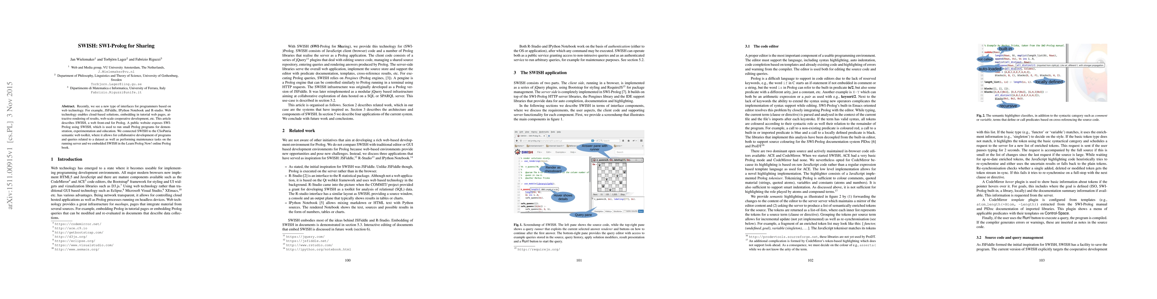 SWISH is a web front-end for SWI-Prolog that enables cloud-based, collaborative, and educational Prolog programming through an attractive web interface. It integrates with the ClioPatria semantic web toolkit and is embedded in the Learn Prolog Now! online resource.